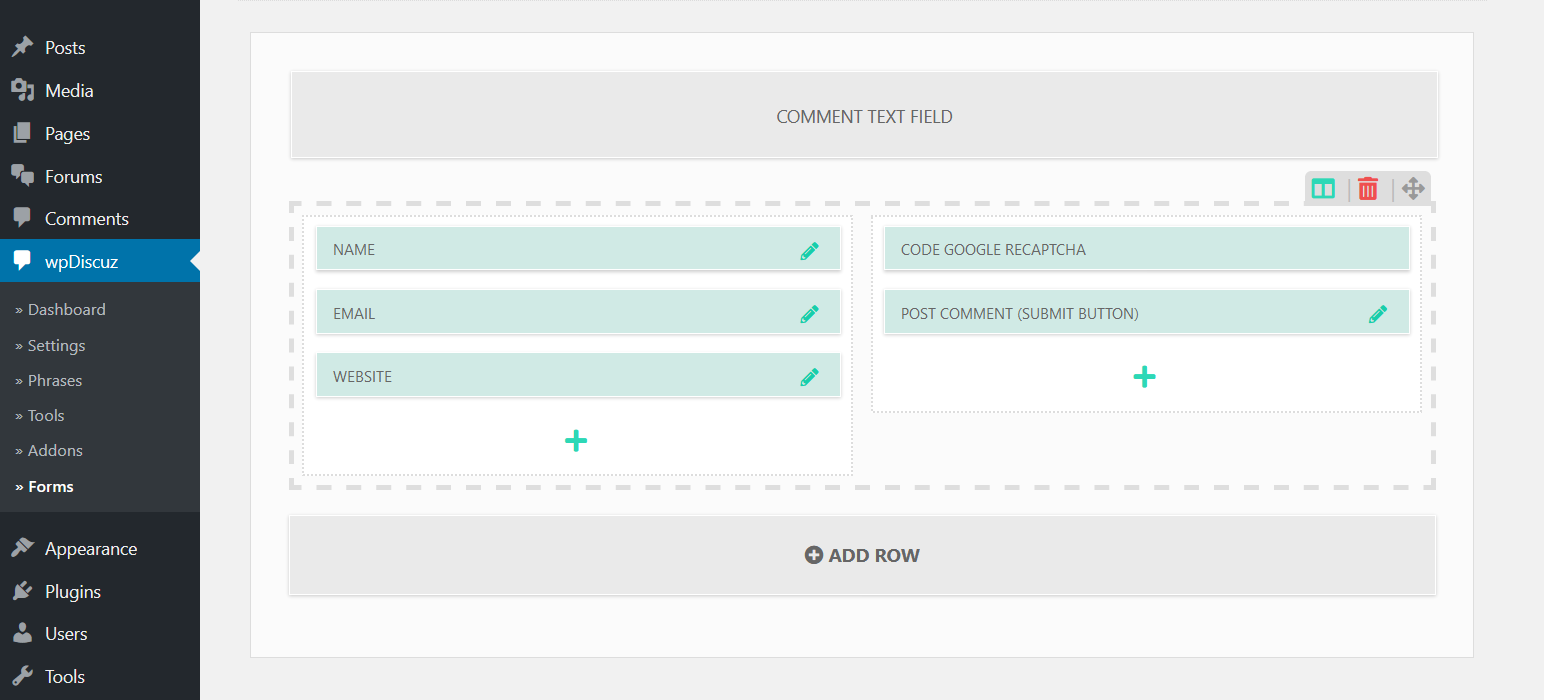 wpDiscuz comment forms can be found and managed in Dashboard > wpDiscuz > Forms admin page. By default, there is one comment form with “Default Form” title. Comment form editing screen consists of the Comment Form Settings area and Comment Form Builder section. In this documentation we’ll go through all tools of comment form builder. The “Comment Form Settings” is described in the previous article.