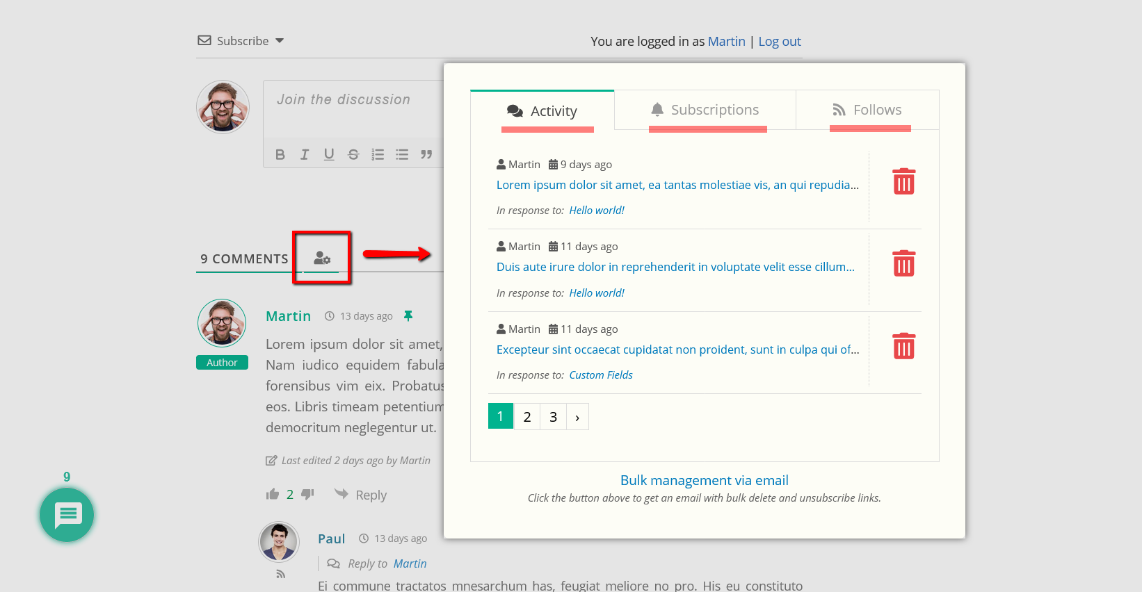 The “My Content & Settings” button is located in comment filter panel on top of all comments, right after the [X Comments] head phrase. This button opens a pop-up window allowing commenters manage their content and settings. In this window they can see three windows “Activity”, “Subscriptions” and “Follows”. They can delete own comments, unsubscribe from any post and unfollow any user. In other words this is the users own data controlling panel.  This is the main GDPR supporting feature.