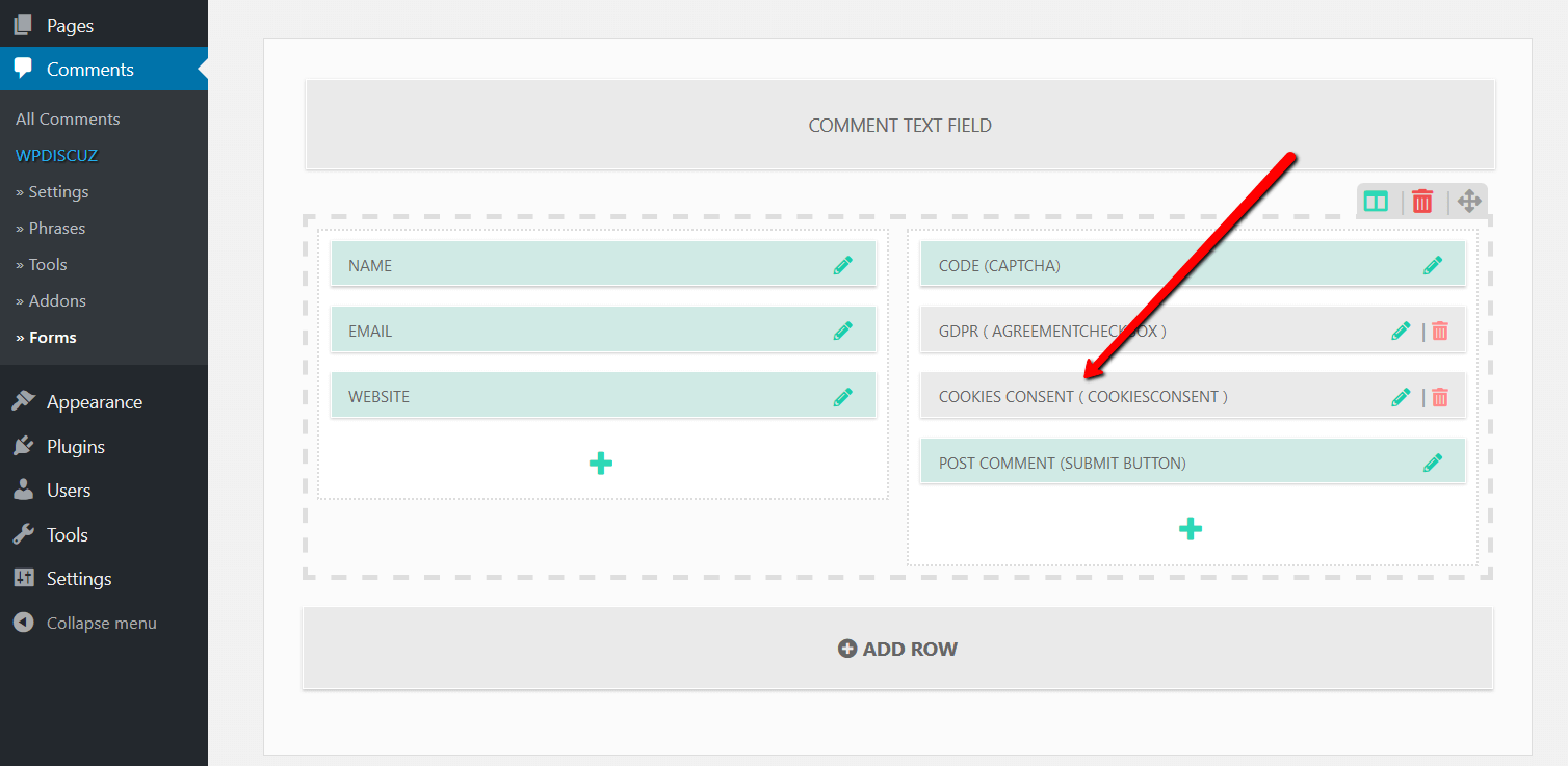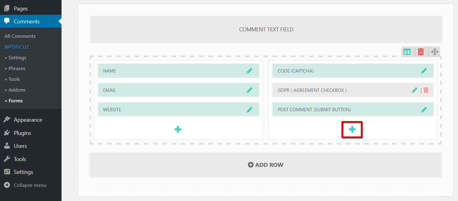We’re going to use wpDiscuz comment from builder to add a custom field (cookies consent checkbox). Please navigate to Dashboard > wpDiscuz > Forms admin page, edit the comment form you use. Click on the [+] button of the column you want to add the Cookies Consent Field (we recommend add it in the right column and put it below all other fields and above the submit button).