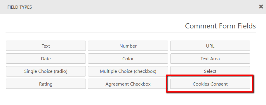 Choose the “Cookies Consent” field type by clicking the [Cookies Consent] button.