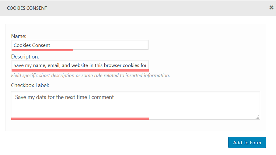 - Description: Save my name, email, and website in this browser cookies for the next time I comment.