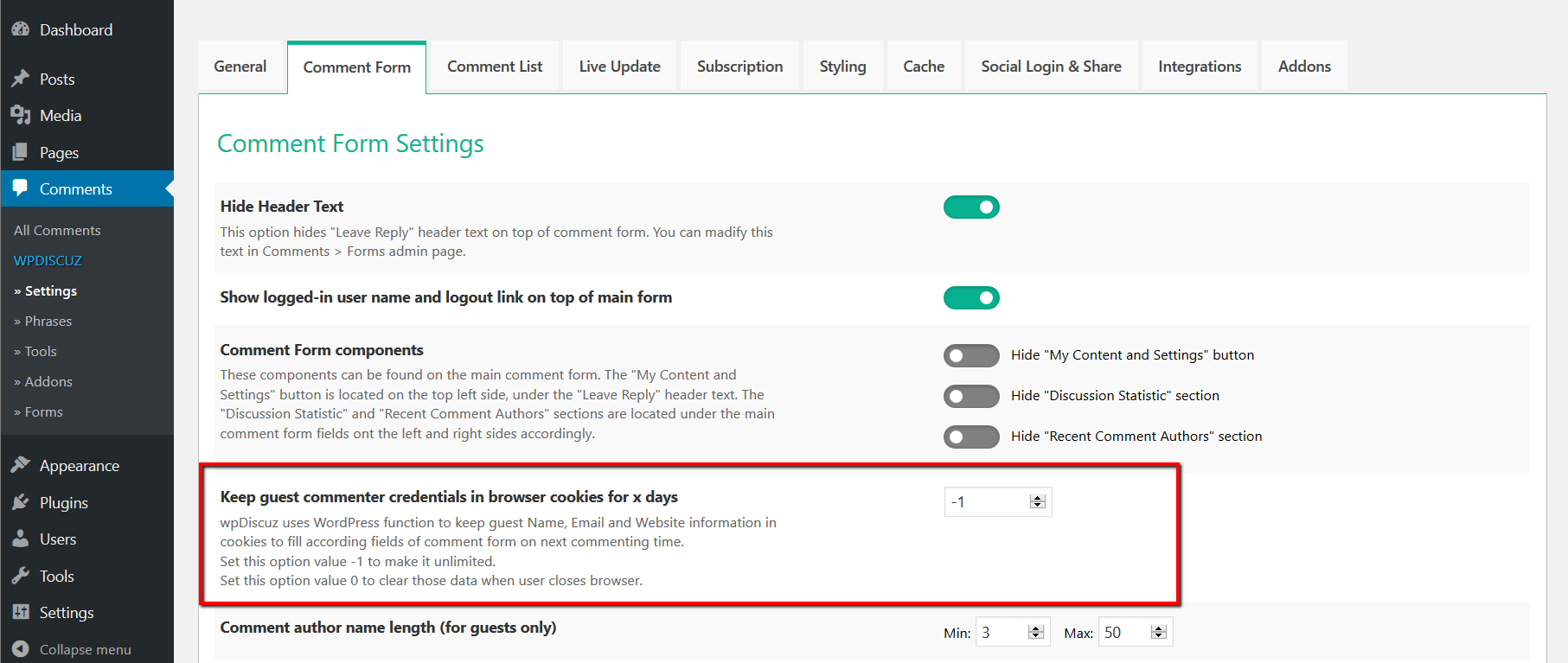 The commenter cookies are set to not expire. By default the life time of cookies are not limited (-1) . Inserting “0” in “Keep guest commenter credentials in browser cookies for x days” option, you can force deleting these cookies when guest close browser. Also you can set certain number of days.