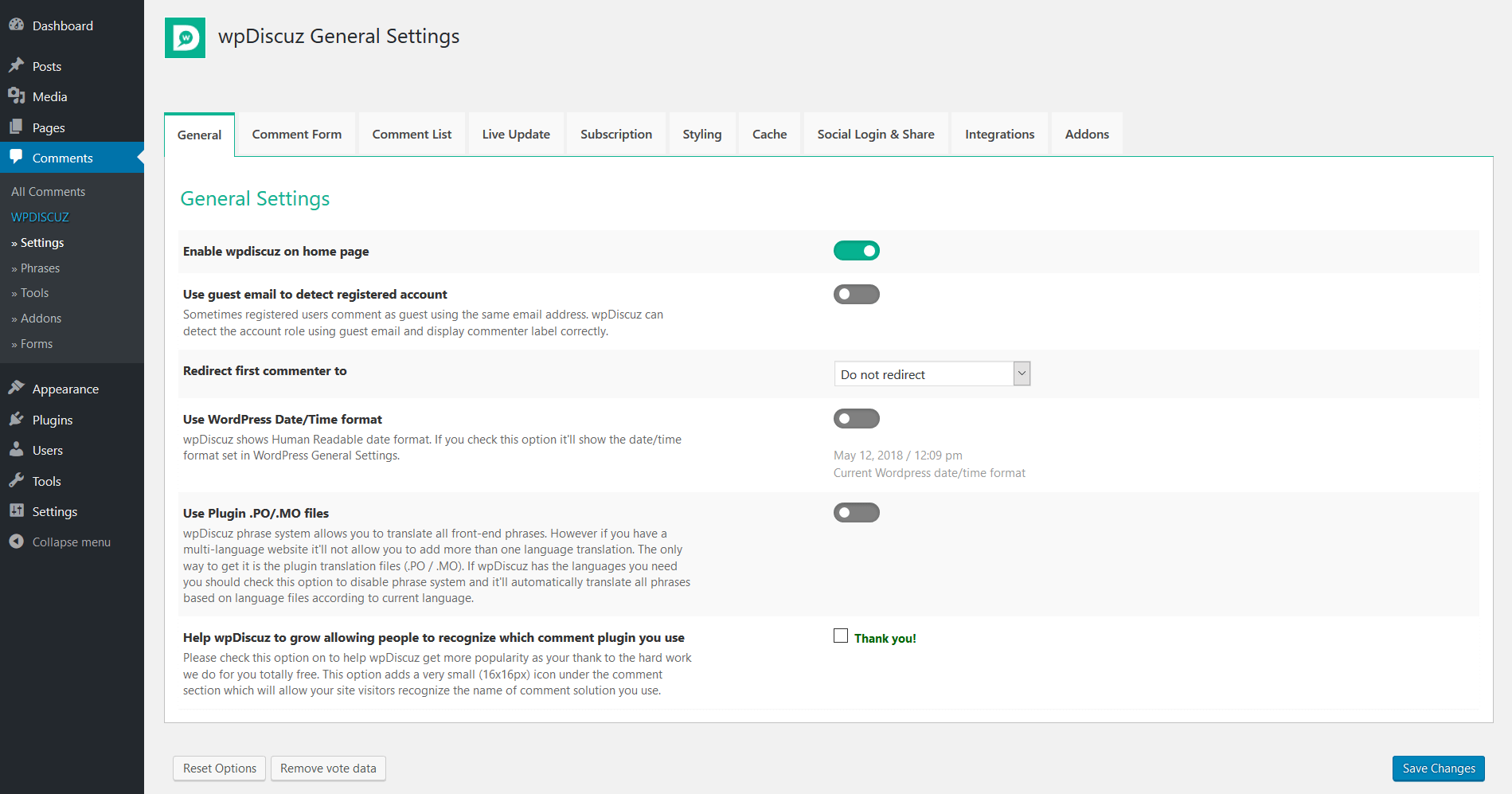 wpDiscuz comment plugin settings are located in Dashboard > Comments > Settings admin page. The first tab is the “General Settings” tab with the settings mentioned below.