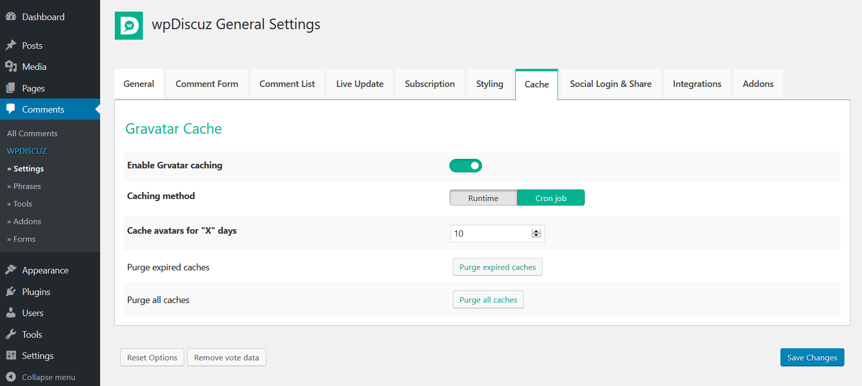 wpDiscuz comment plugin settings are located in Dashboard > Comments > Settings admin page. The seventh tab is the “Cache” tab. It includes all settings related to comment author avatar caching.