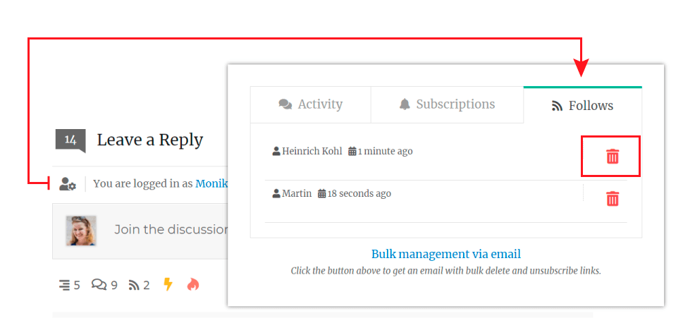 As mentioned above wpDiscuz has double opt-in subscription system. A double opt-in means that not only does the visitor have to enter their email and click sign up, they also have to confirm their subscription via a link which send to them in a confirmation email. wpDiscuz user Following feature is also integrated with double opt-in subscription system. If “Follow users without email confirmation” option is disabled, after clicking on the “Follow” icon-button, users receive email confirmation and a link to click and confirm their subscription to certain user.