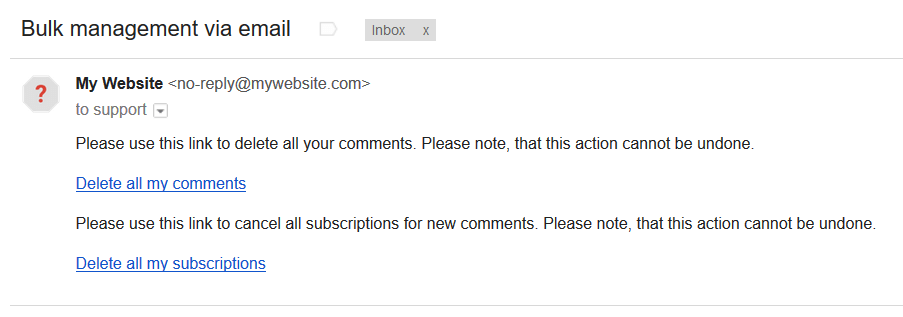 This button also allows Guests to cancel own comment subscriptions with email confirmation. Guests click on [Cancel all comment subscriptions] button and receive a “Delete all my subscriptions” link on the email address they used to post comments. In this way guests confirm ownership of subscriptions they want to delete and they do that securely.