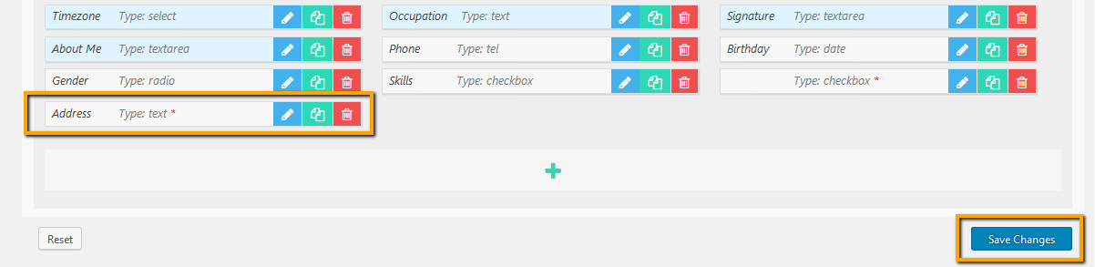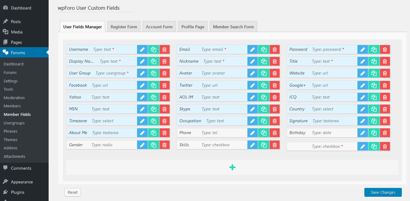 Once you’ve created new fields and done all necessary customization click on [Save Changes] button. Now you can navigate to next tabs to customize Registration, Account and Member Search Forms, as well as the User Profile page fields.