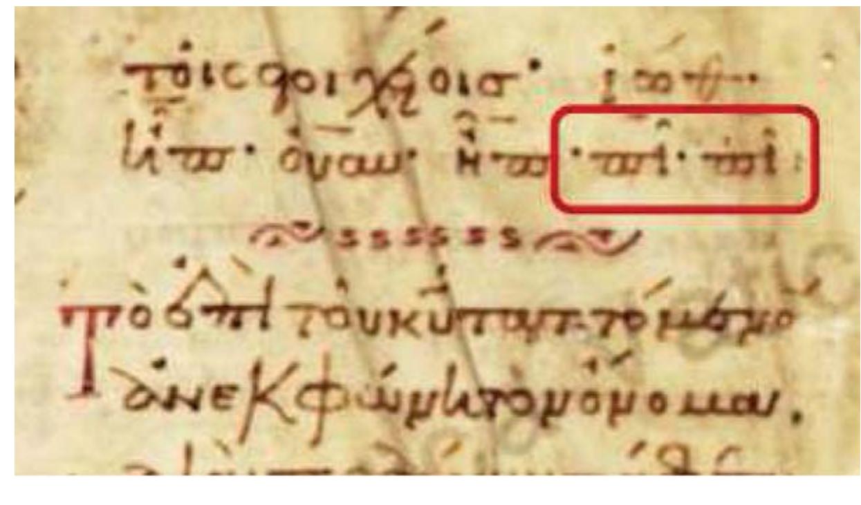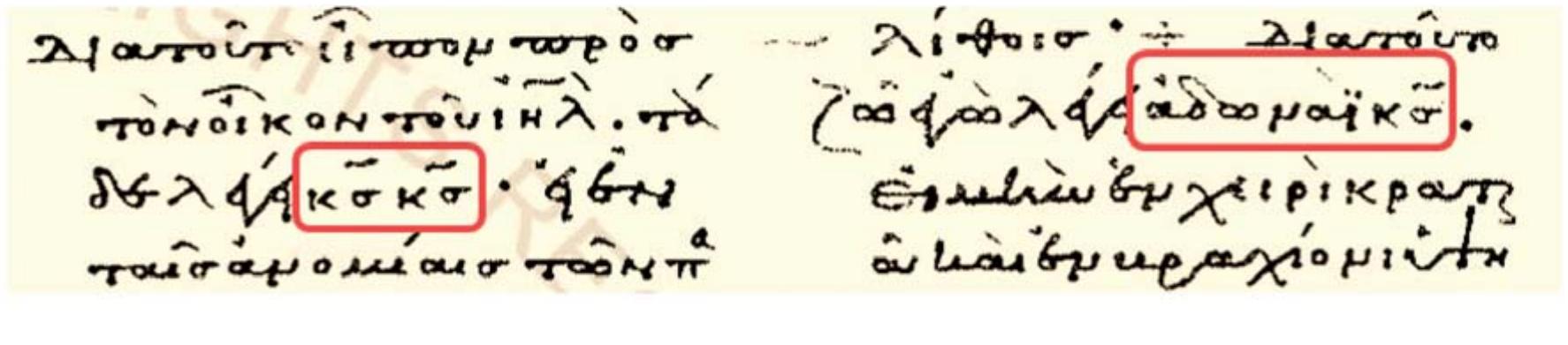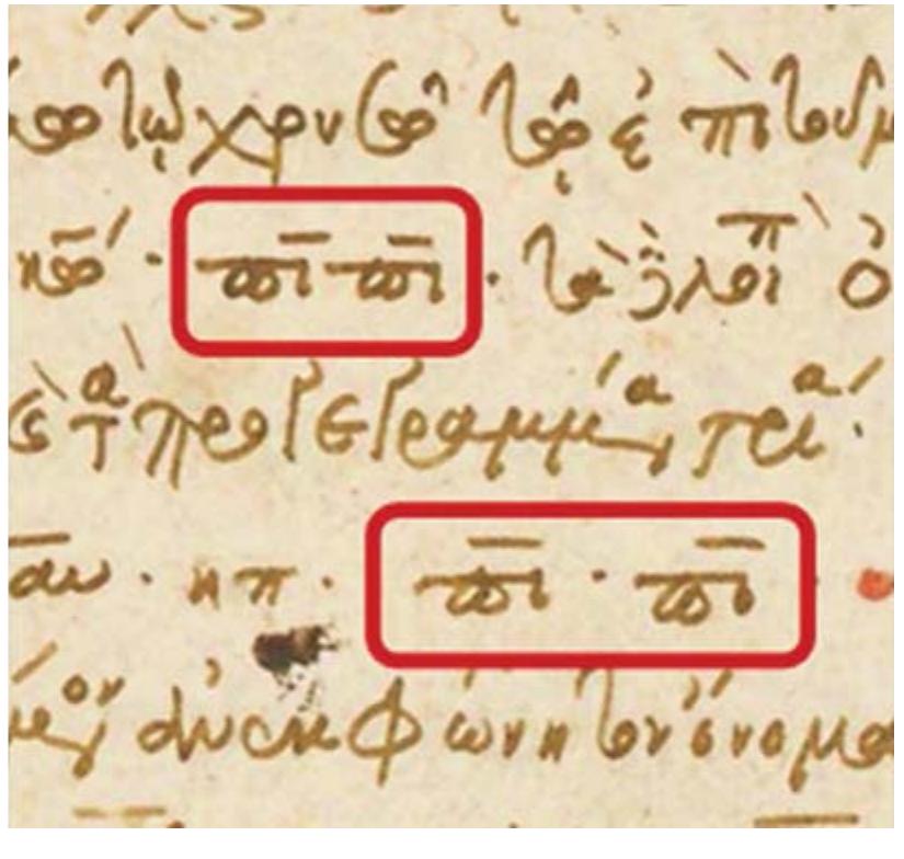 - Nikolaos transliterates holam with omega, e.g. ἐλωὶμ (fol. 2v ; Hoffmann ed., p. 6), ἀδωνάι (ibid.), κῶδες (fol. 24r, Hoffmann ed., p. 44); and with omicron, e.g. ἀνοχὶ (fol. 2v, Hoffman ed., p. 6), βιγιό, μέρους (fol. 42r; Hoffmann ed., p. 78), and νεχικὸθ (fol. 89v; Hoffmann ed., p. 164).