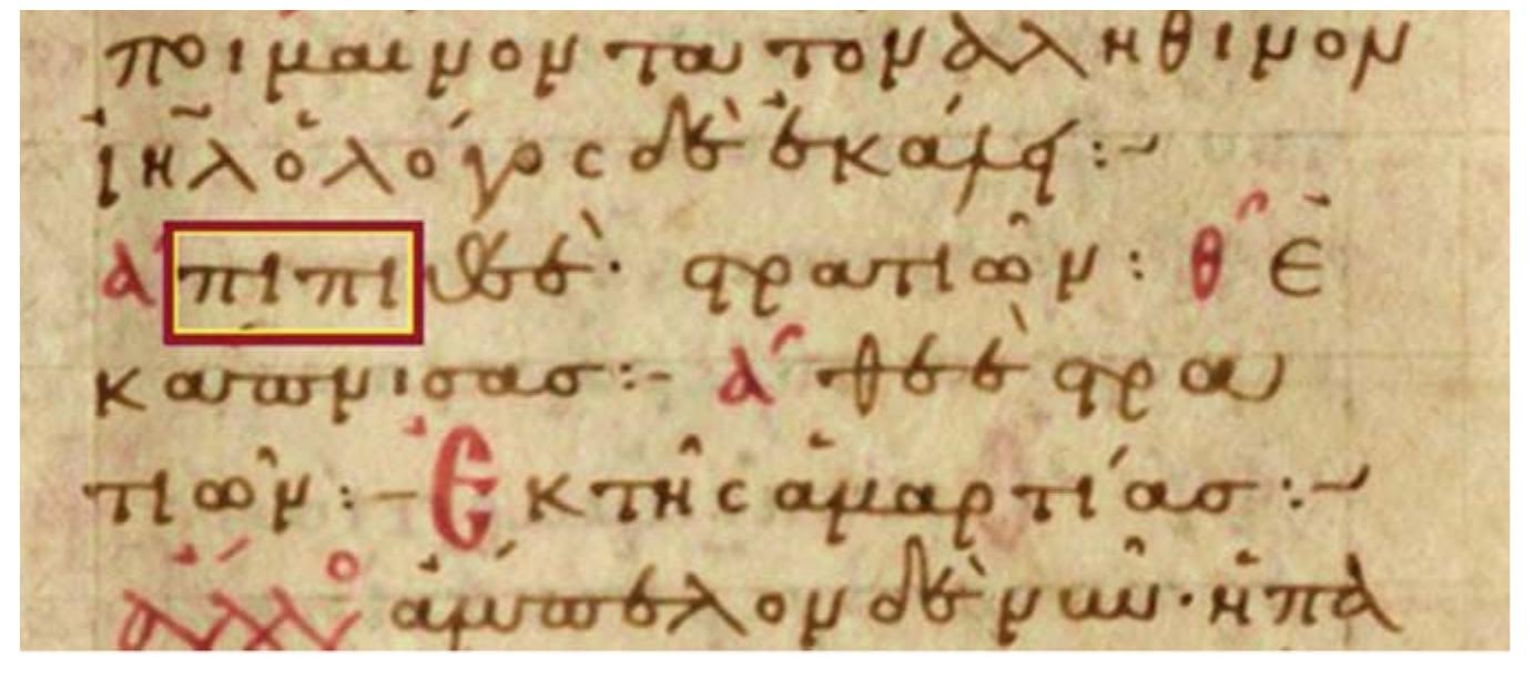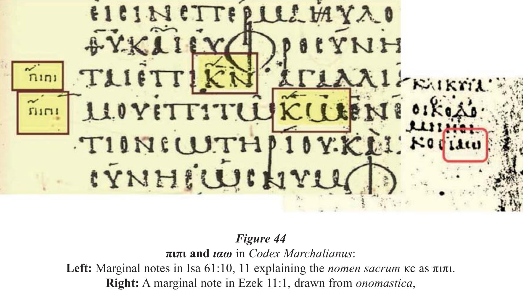 - Robert J. WILKINSON, Tetragrammaton : Western Christians and the Hebrew Name of God, Brill, Leiden- Boston, 2015, p. 213-279. As already discussed, a notable exception is the transmission of Hexaplaric material, mainly found in marginal notes of Septuagint manuscripts, commentaries by Christian authors and onomastica (John D. MEADE, Hexaplaric Greek translations, in : The Hebrew Bible, Vol. 1B : Pentateuch, Former and Latter Prophets, eds. Armin LANGE, Emanuel TOV, Brill, Leiden-Boston, 2016, p. 637-643). Fig. 44 includes images of Ms. Vat. gr. 2125 with Hexaplaric marginal notes explaining that the nomen sacrum κc is equivalent to the Tetragrammaton in the form πιπι and material from onomastica that include ιαω.
