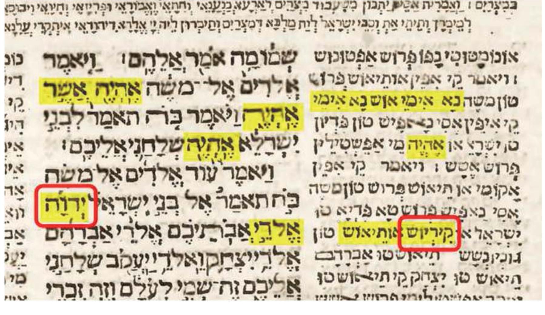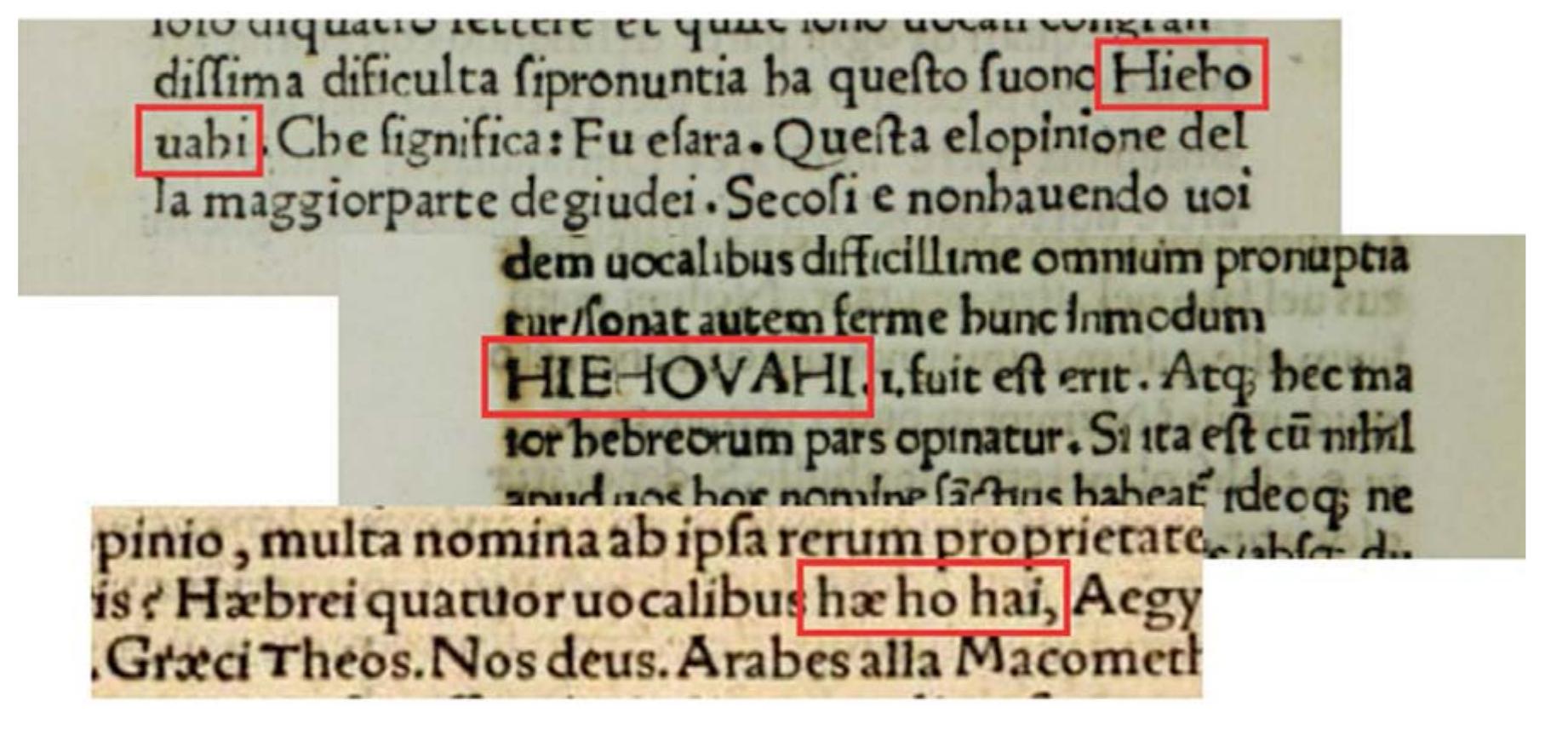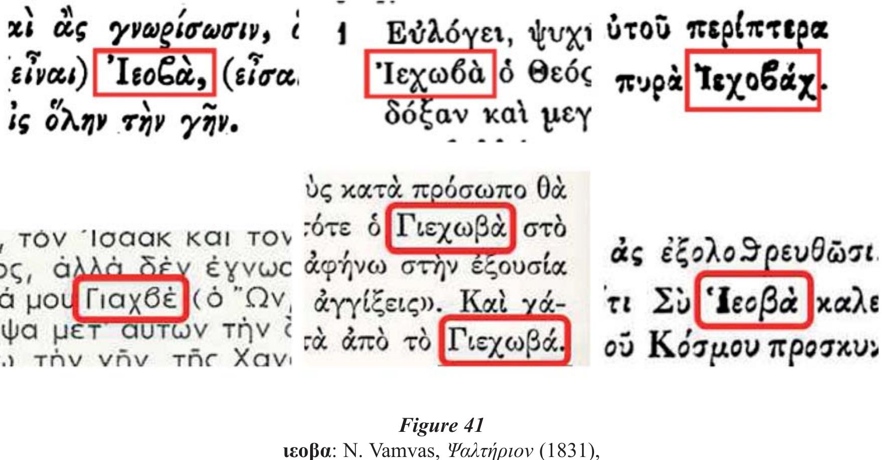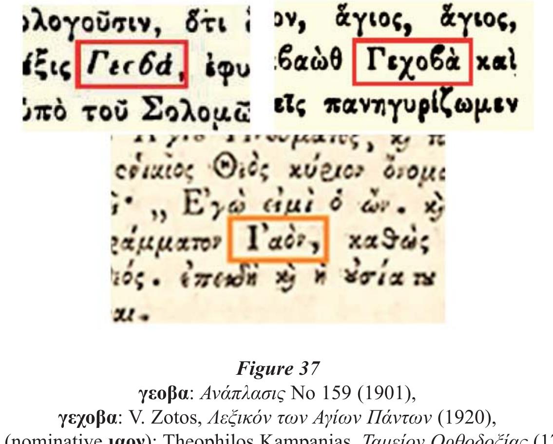 - Marsilio Ficino uses Hiehouahi in the Italian translation of his De Christiana religione (chapter "De Miracoli," 1474-75), HIEHOVAHI in his Latin De Christiana religione (chapter "De Miraculis," 1476), and hae ho hai is found in his Opera (1576, p. 1218). process of "Lordization," a special case of semantic translation appears in the Greek translation of selected Old Testament books in Codex Marcianus gr. 7 (=377, Graecus Venetus, Venice) of the 14 th century prepared by a Christian hand, probably of Jewish origin, well-versed in Hebrew and likely with the help of some Jewish scholars 69 . The Tetragrammaton is translated in every appearance by one of three terms : οντωτής, οντουργός or ουσιωτής and is usually followed by the nomen sacrum θc (see fig. 46). These terms roughly translate as "Maker of Being[s]" and "Maker of Existence," i.e. the Creator of everything. While there may have been some attempts at disguising the Tetragrammaton to prevent it from being accidentally or intentionally pronounced, the opposite also took place. In 2015, attention was drawn to a rare case of a Greek rendering of the Tetragrammaton. It regards a transliteration of the Tetragrammaton as γεχαβά /je.xa.ˈva/ that appears in Nikolaos of Otranto's Dialogue Against the Jews (ca. 1220 ; see fig. 47) 70 .