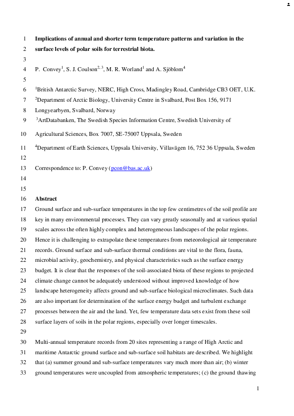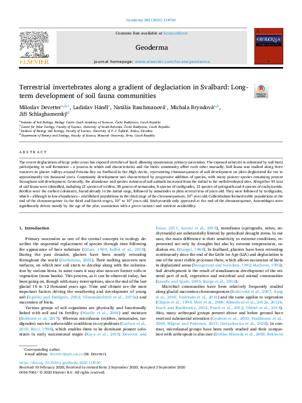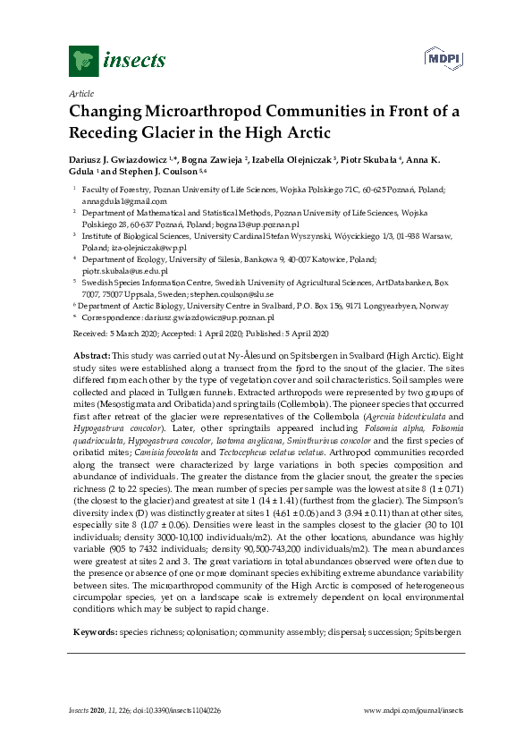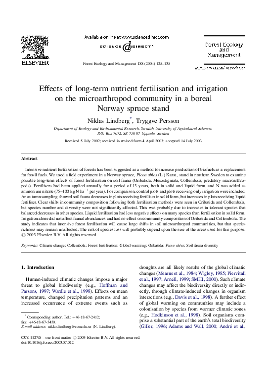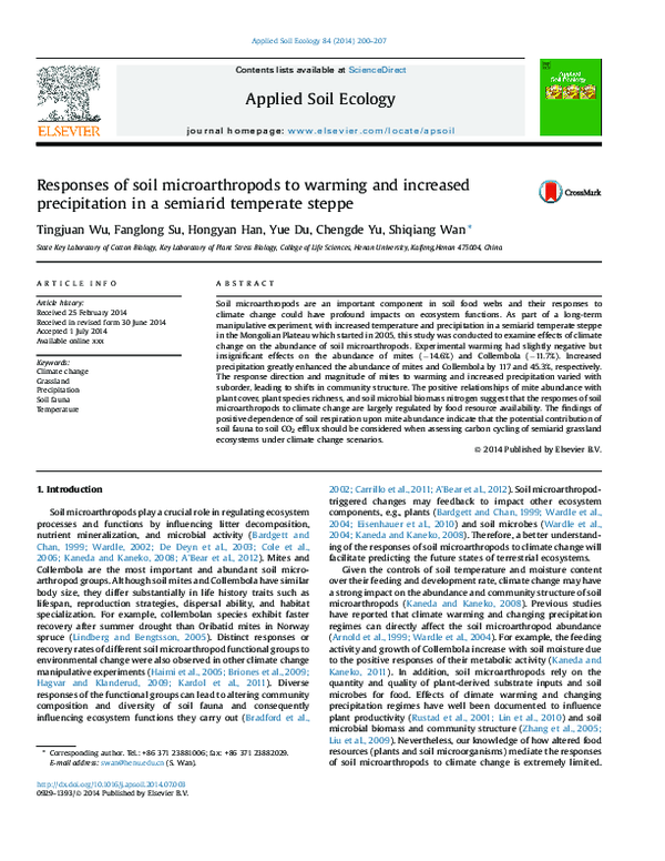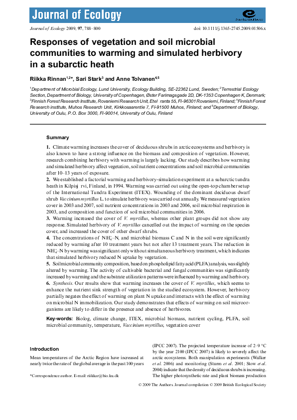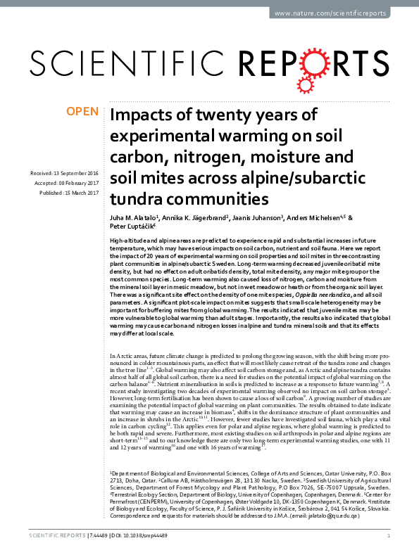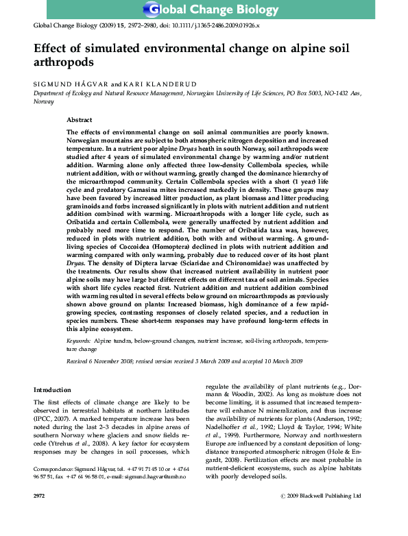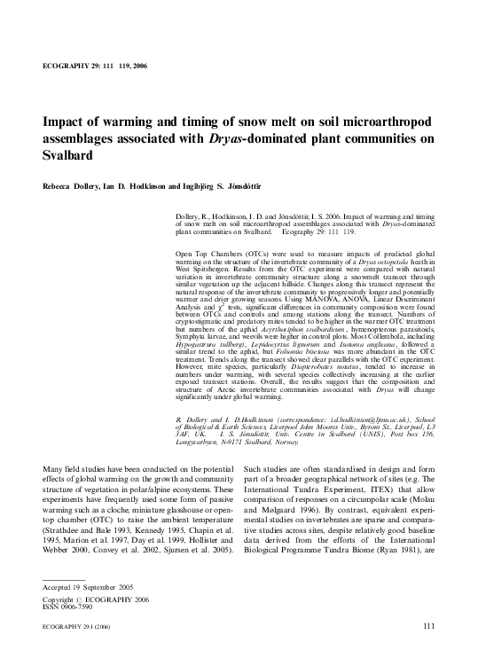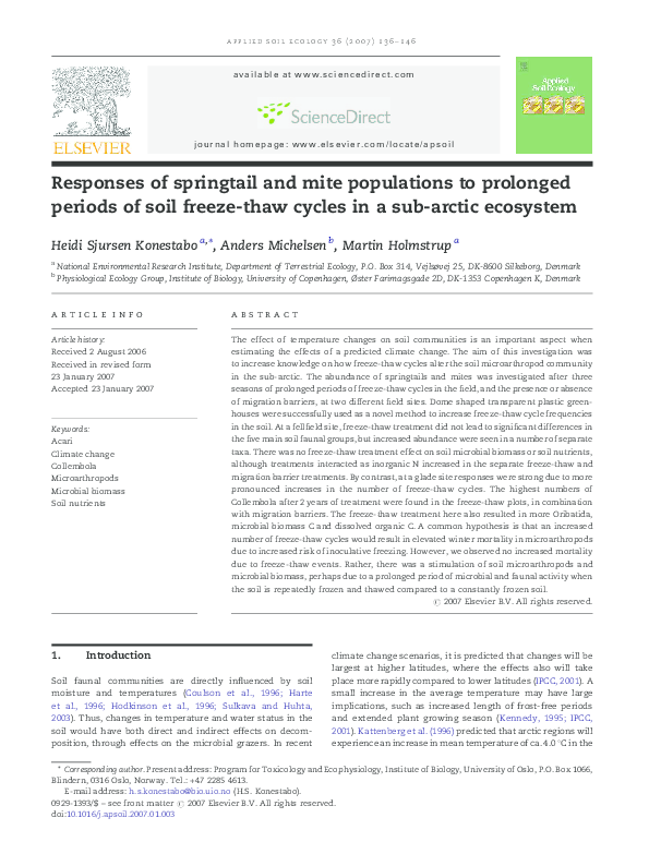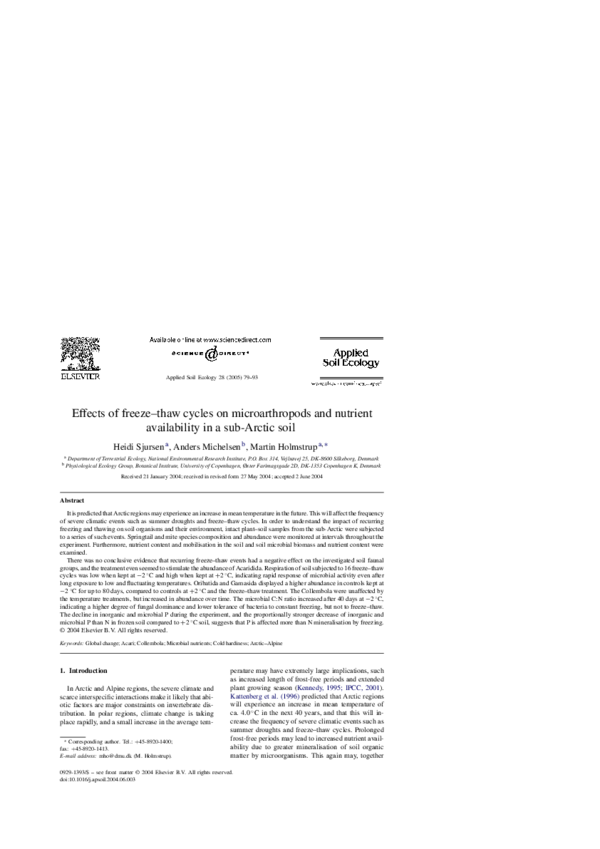Agrell, I., 1941. Zur O ¨kologie der Collembolen. Opusc. Ent. Suppl. 3, 1-236.Anderson, J.M., 1992. Responses of soils to climate change. Adv. Ecol. Res. 22, 163-210.Balogh, J., 1972. The Oribatid Genera of the World. Akademiai Kiado, Budapest, Hungary, 188 pp.Behan, V.M., Hill, S.B., 1978. Feeding habits and spore dispersal of oribatid mites in the North American Arctic. Rev. E ´col. Biol. Sol. 15, 497-516.Chernov, Y.I., 2002. Arctic biota: taxonomic diversity. Zool. Zhurn. 81, 1411-1431.Christensen, T.R., Michelsen, A., Jonasson, S., Schmidt, I.K., 1997. Carbon dioxide and methane exchange of a subarctic heath in response to climate change related environmental manipula- tions. Oikos 79, 34-44.Coulson, S.J., Hodkinson, I.D., Webb, N.R., Block, W., Bale, J.S., Strathdee, A., Worland, M.R., Wooley, C., 1996. Effects of experimental temperature elevation on high-arctic soil micro- arthropod populations. Polar Biol. 16, 147-153.Coulson, S.J., Leinaas, H.P., Ims, R.A., Søvik, G., 2000. Experi- mental manipulation of the winter surface ice layer: the effects on a high arctic soil microarthropod community. Ecography 23, 299-306.Dalenius, P., 1960. Studies on the Oribatei (Acari) of the Tornetra ¨sk territory in Swedish Lapland. I. A list of the habitats, and the composition of their oribatid fauna. Oikos 11, 80-124.Dalenius, P., 1962. Studies on the Oribatei (Acari) of the Tornetra ¨sk territory in Swedish Lapland II: some notes concerning the microclimate of the habitats. Arkiv Zoologi 20, 317-346.Davidson, E.A., Belk, E., Boone, R.D., 1998. Soil water content and temperature as independent or confounded factors controlling soil respiration in a temperate mixed hardwood forest. Global Change Biol. 4, 217-227.Fjellberg, A., 1980. Identification Keys to Norwegian Collembola. Norsk Entomologisk Forening, A ˚s, Norway, 152 pp.Fjellberg, A., 1998. The Collembola of Fennoscandia and Denmark. Part I. Poduromorpha. Fauna Ent. Scand. 35, 184.Havstro ¨m, M., Callaghan, T.V., Jonasson, S., 1993. Differential growth-responses of Cassiope tetragona, an arctic dwarf-shrub, to environmental perturbations among 3 contrasting high sites and sub-arctic sites. Oikos 66, 389-402.Harte, J., Rawa, A., Price, V., 1996. Effects of manipulated soil microclimate on mesofaunal biomass and diversity. Soil Biol. Biochem. 28, 313-322.Hodkinson, I.D., Coulson, S.J., Webb, N.R., Block, W., 1996. Can high arctic soil microarthropods survive elevated summer temperatures? Funct. Ecol. 10, 314-321.Hodkinson, I.D., Webb, N.R., Bale, J.S., Block, W., Coulson, S.J., Strathdee, A.T., 1998. Global change and arctic ecosystems: conclusions and predictions from experiments with terrestrial invertebrates on Spitsbergen. Arctic Alpine Res. 30, 306-313.Ineson, P., Leonard, M.A., Anderson, J.M., 1982. Effect of collem- bolan grazing upon nitrogen and cation leaching from decom- posing leaf litter. Soil Biol. Biochem. 14, 601-605.IPCC, 2001. Climate change 2001: the scientific basis. Contribution of Working Group I to the Third Assessment Report on the Intergovernmental Panel on Climate Change. Cambridge Uni- versity Press, Cambridge, UK, 944 pp.Jonasson, S., Havstro ¨m, M., Jensen, M., Callaghan, T.V., 1993. In- situ mineralization of nitrogen and phosphorus of arctic soils after perturbations simulating climate-change. Oecologia 95, 179-186.Jonasson, S., Michelsen, A., Schmidt, I.K., 1999a. Coupling of nutrient cycling and carbon dynamics in the arctic, integration of soil microbial and plant processes. Appl. Soil Ecol. 11, 135- 146.Jonasson, S., Michelsen, A., Schmidt, I.K., Nielsen, E.V., 1999b. Responses in microbes and plants to changed temperature, nutrient, and light regimes in the arctic. Ecology 80, 1828- 1843.Jørgensen, H.B., Elmholt, S., Petersen, H., 2003. Collembolan dietary specialisation on soil grown fungi. Biol. Fertil. Soils 39, 9-15.Krantz, G.W., 1978. A Manual of Acarology, second ed. Oregon State University Book Stores, Corvallis, US, 509 pp.Lloyd, J., Taylor, J.A., 1994. On the temperature dependence of soil respiration. Funct. Ecol. 8, 315-323.MacFadyen, A., 1961. Improved funnel-type extractors for soil arthropods. J. Anim. Ecol. 30, 171-184.Maraun, M., Migge, S., Schaefer, M., Scheu, S., 1998. Selection of microfungal food by six oribatid mite species (Oribatida Acari) from different beech forests. Pedobiology 42, 232-240.Martikainen, E., Huhta, V., 1990. Interactions between nematodes and predatory mites in raw humus soil: a microcosm experiment. Rev. Ecol. Biol. Sol. 27, 13-20.Mebes, K.H., Filser, J., 1998. Does the species composition of Collembola affect nitrogen turnover? Appl. Soil Ecol. 9, 241-247.Michelsen, A., Jonasson, S., Sleep, D., Havstro ¨m, M., Callaghan, T.V., 1996. Shoot biomass, d 13 C, nitrogen and chlorophyll responses of two arctic dwarf shrubs to in situ shading, nutrient application and warming simulating climatic change. Oecologia 105, 1-12.Nadelhoffer, K.J., Giblin, A.W., Shaver, G.R., Linkins, A.E., 1992. Microbial soil processes and plant nutrient availability in arctic soils. In: Chapin, F.S., Jefferies, R.L., Reynolds, J.F., Shaver, G.R., Svoboda, J. (Eds.), Arctic Ecosystems in a Changing Climate, An Ecophysiological Perspective. Academic Press, San Diego, CA, USA, pp. 281-300.Norton, R.A., 1993. Evolutionary aspects of oribatid mites life- histories and consequences for the origin of the Astigmata. In: Houck, M.A. (Ed.), Mites: Ecological and Evolutionary Ana- lyses of Life-history Patterns. Chapman and Hall, New York, pp. 99-135.Petersen, H., 1978. Some properties of two high gradient extractors for soil microarthropods. Nat. Jutl. 20, 95-121.Ruess, L., Michelsen, A., Jonasson, S., 1999a. Simulated climate change in subarctic soils: responses in nematode species com- position and dominance structure. Nematology 1, 513-526.Ruess, L., Michelsen, A., Schmidt, I.K., Jonasson, S., 1999b. Simulated climate change affecting microorganisms, nematode density and biodiversity in su