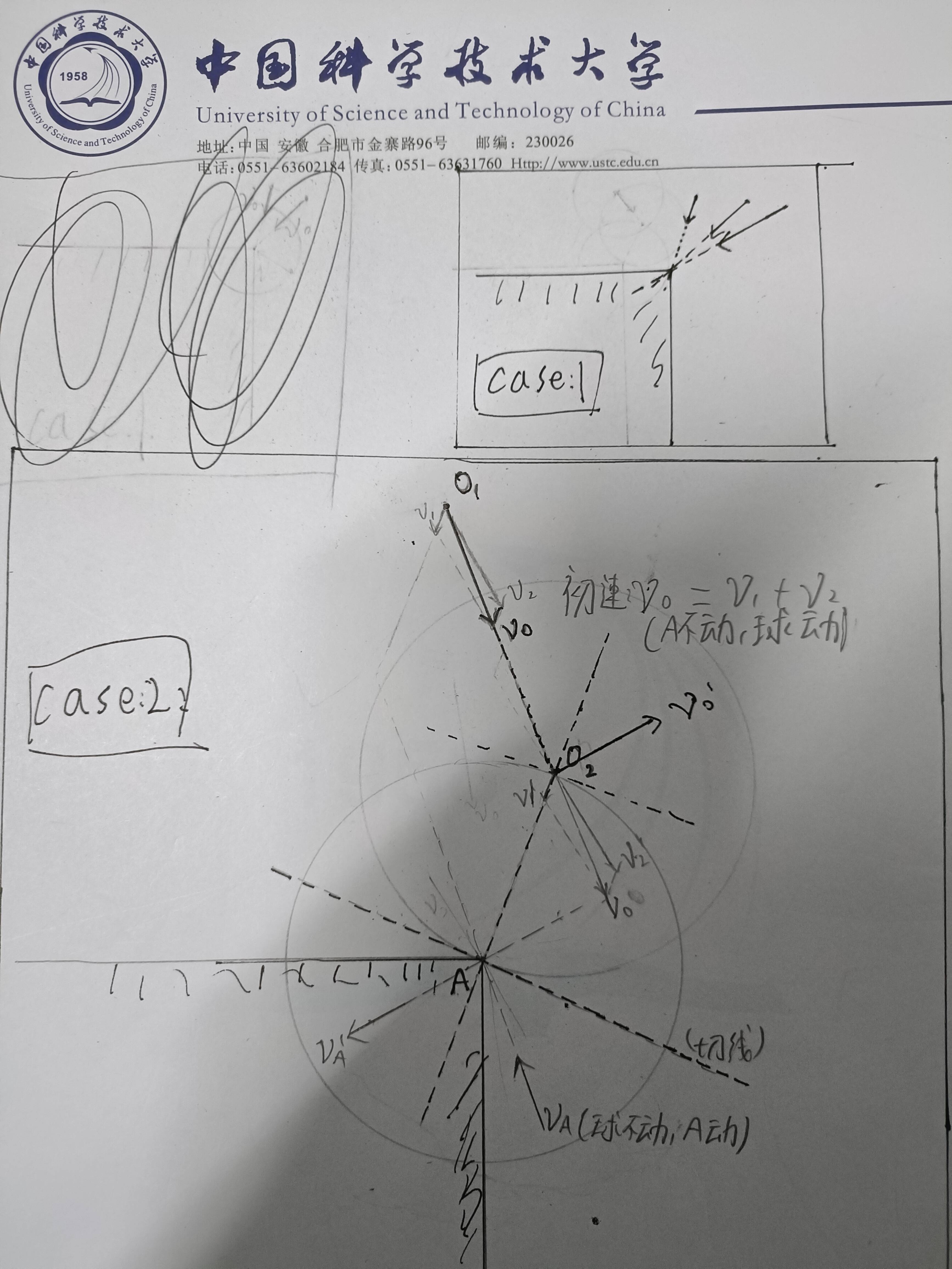 对于第二种情况,碰撞前的速度和碰撞后的速度嘤该关于 \(O_2A\) 对称(转换参照物后,就相当于是点 \(A\) 在切面上发生了镜面反弹)。其中 \(O_2\) 为发生碰撞时圆心的位置,\(A\) 为砖块尖角。