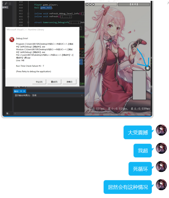 //砖块受到攻击 print_background();//砖块变化前先抠掉小球 brick[bk_Rid].vanish();//砖块变化 playgame_ball_getimage();//重新获取小球背景图像 print();//重新输出小球 测试的时候出现了很混乱的状况,各种奇怪数据乱跳,调了一个多小时,发现写栈的时候,同一个点被重复加入了几百次,各种越界起飞...