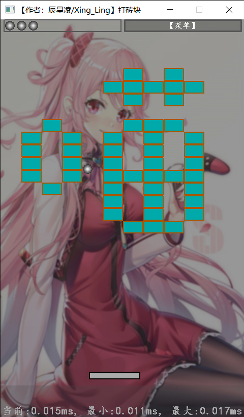 小测试了一波,每两次刷新的间隔大约是 \(11\sim 18ms\)(算上固定 \(10ms\) 的 \(\text{Sleep}\)),撞墙的时候最高可以达到 \(25ms\),也就是大约 \(40\sim 90\) 帧的亚子,目前来看大致合格吧。不过当后面各种检测越来越多并加上砖块刷新后就需要调整了。有了这个标准之后调 \(\text{Sleep}\) 参数会舒服许多。