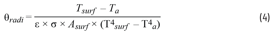 where ε is the material thermal emissivity, σ is the Stefan-Boltzmann constant, Asurf is the surface area (m2), Tsurf is the surface temperature (K), and Ta is the ambient temperature (K).