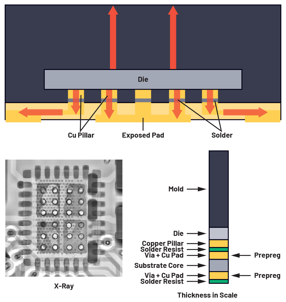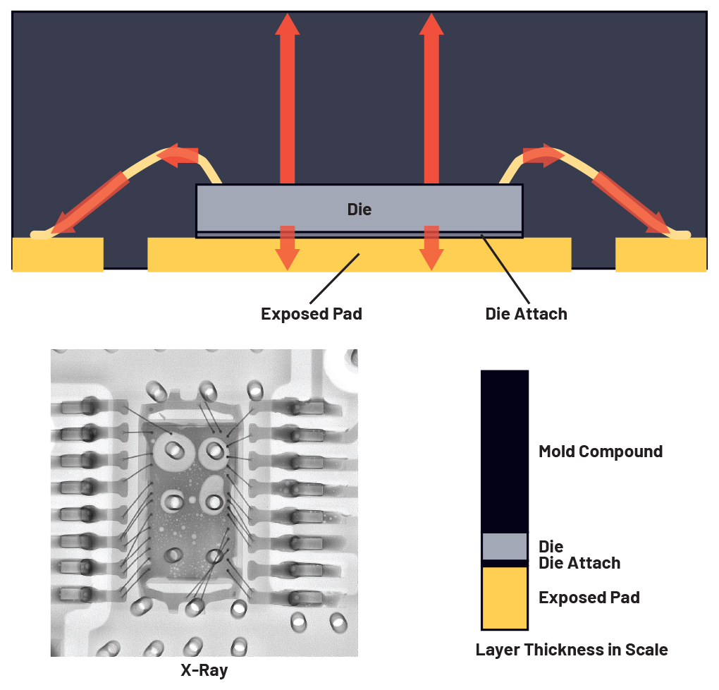 The additional silicon on top reduces the thermal resistance (θJT) from the heat source to the case top, thereby enhancing thermal dissipation through the top of the package. However, under natural cooling conditions, the exposed die package does not significantly enhance thermal performance due to other system-level factors affecting overall thermal resistance. Further details on the thermal benefits of the exposed die package will be provided in Part 2.
