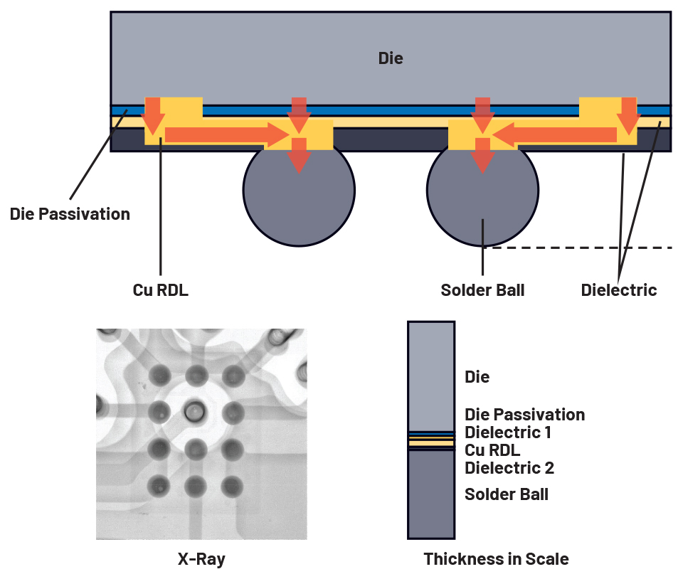 Figure 4 illustrates the standard structure of a WLCSP. Correspondingly, Table 4 provides detailed information on WLCSP, highlighting that the optimal thermal dissipation path, characterized by the lowest thermal resistance, is achieved through the die-Cu redistribution layer (RDL)-solder ball configuration.