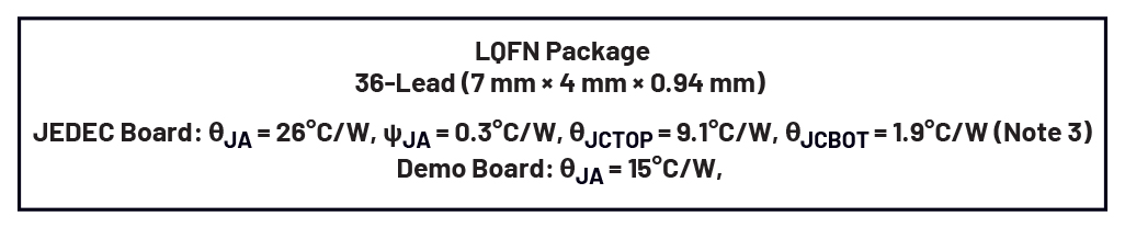 Both JEDEC and demo board θJA values are presented in the example. The JEDEC board is constructed according to JEDEC standard 51-7 for measuring thermal parameters.4 Typically, JEDEC boards do not have an optimized layout for thermal dissipation, resulting in a higher θJA compared to demo boards. Generally, the θJA on a JEDEC board reflects the thermal performance of the IC package itself, while the θJA on a demo board indicates the optimized system design value.