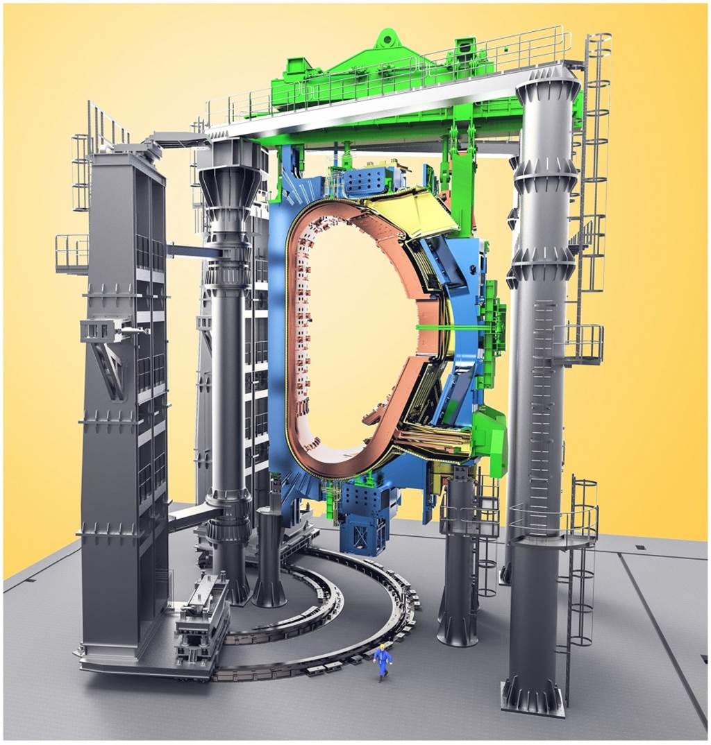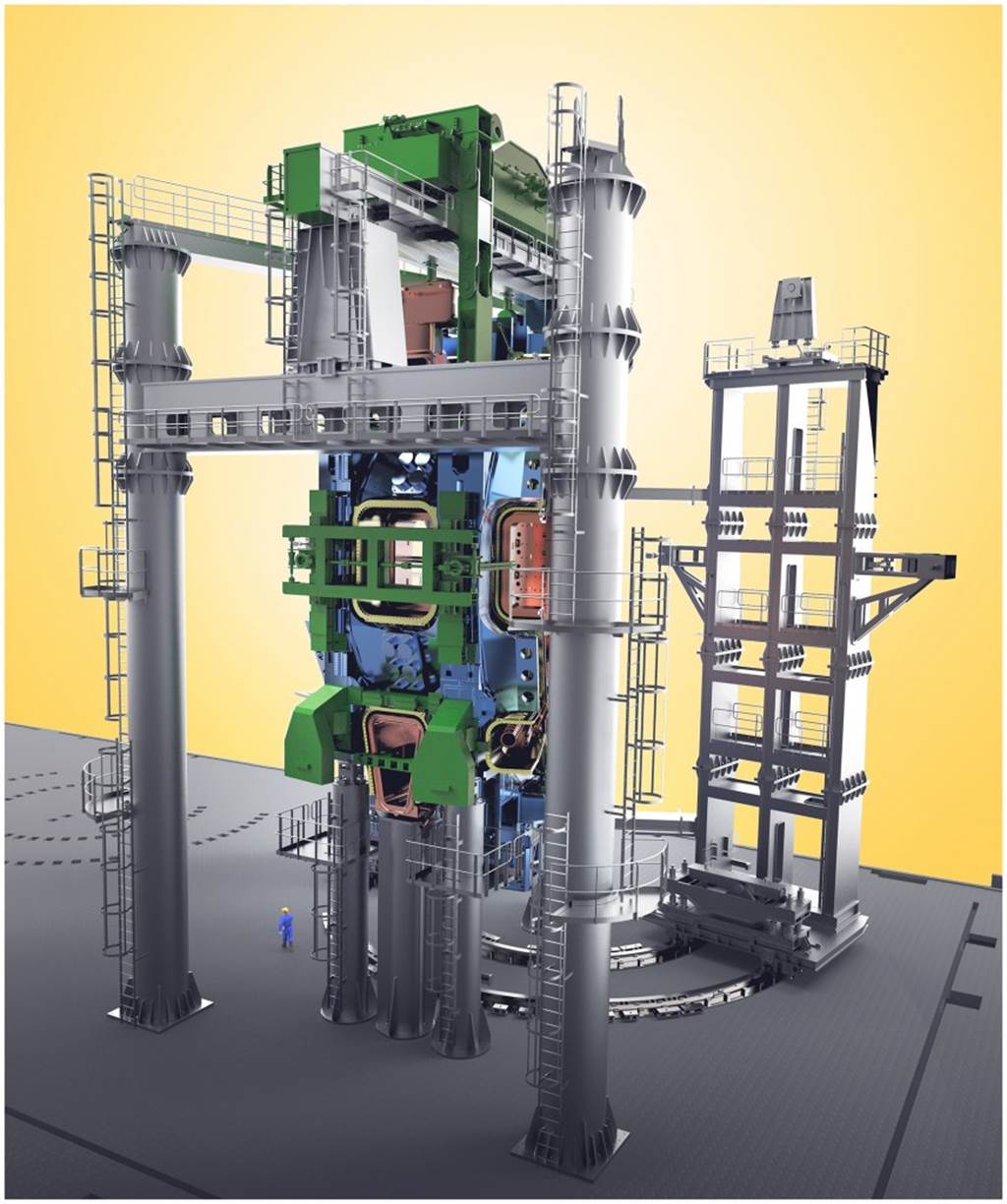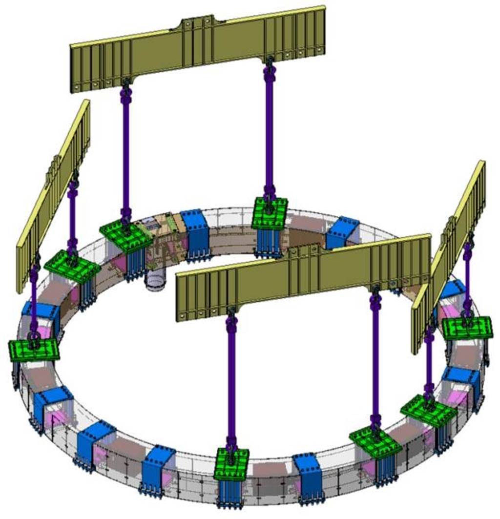 Formed from a central column and nine radial beams, this tool is installed inside of the Tokamak Pit to support, align and stabilize vacuum vessel sub-assemblies as they are joined and welded. With the central column anchored to the Tokamak Building basemat and the radial beams supported between the column and the concrete bioshield, the in-pit assembly tool is designed to support a nominal weight of 5,400 tonnes. (Procured by Korea)