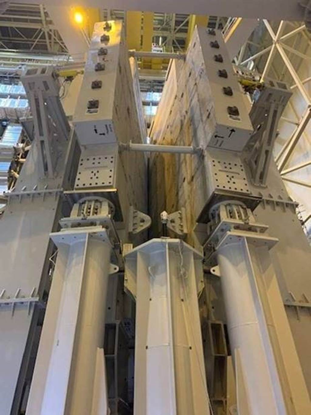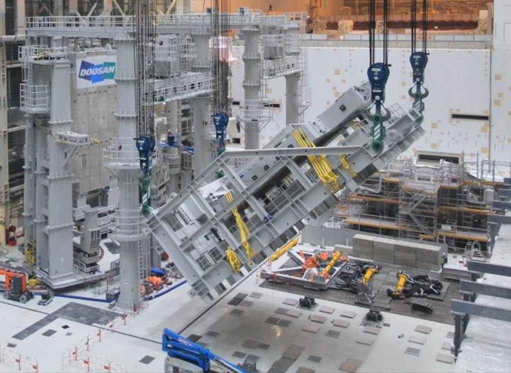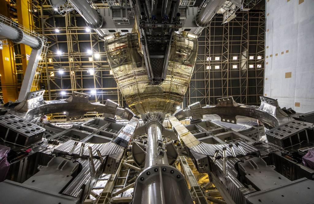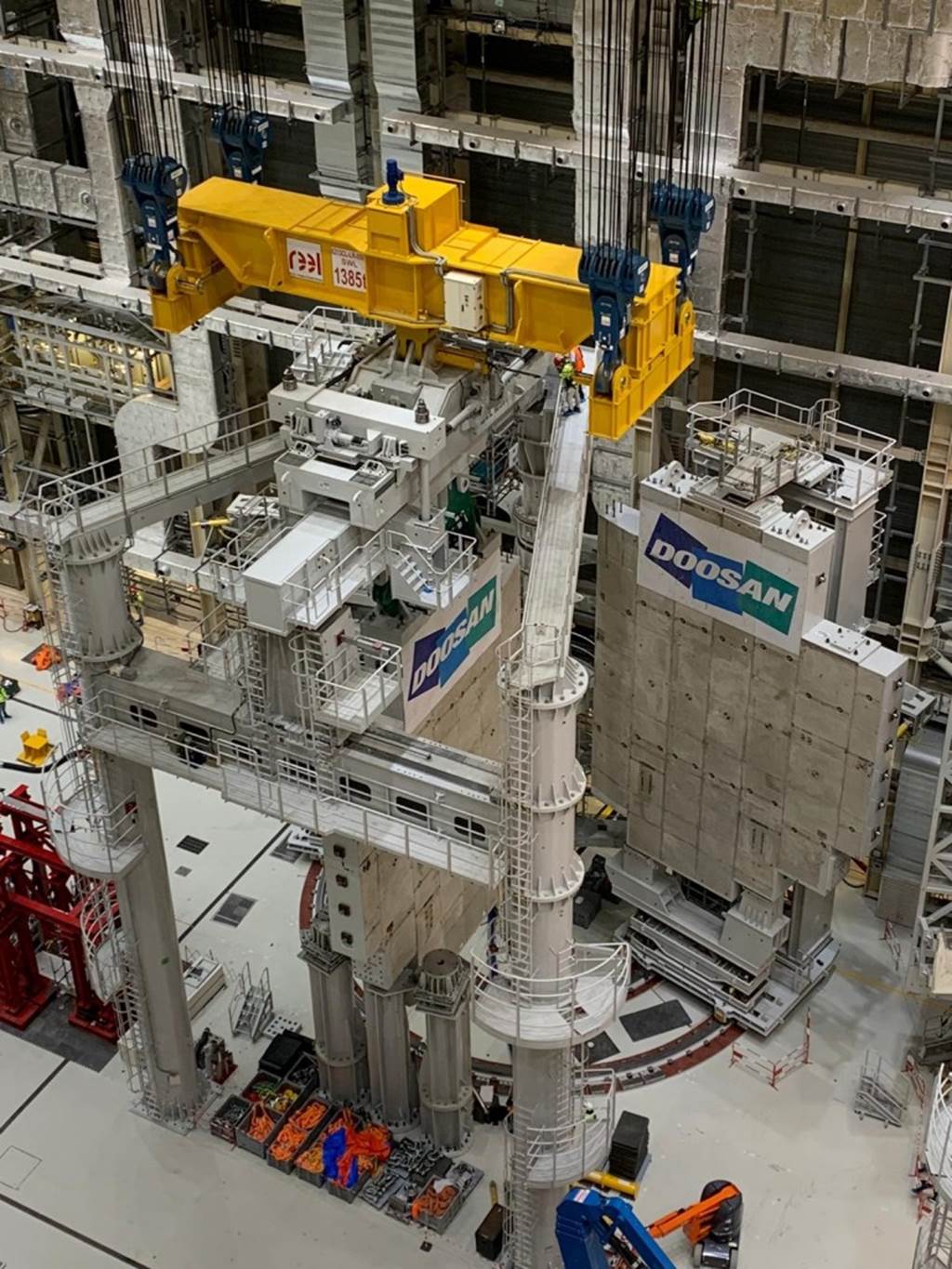 Formed from a central column and nine radial beams, this tool is installed inside of the Tokamak Pit to support, align and stabilize vacuum vessel sub-assemblies as they are joined and welded. With the central column anchored to the Tokamak Building basemat and the radial beams supported between the column and the concrete bioshield, the in-pit assembly tool is designed to support a nominal weight of 5,400 tonnes. (Procured by Korea)