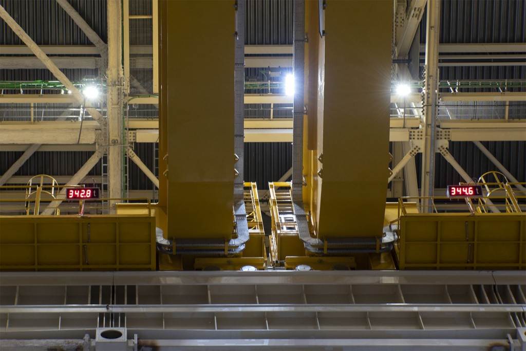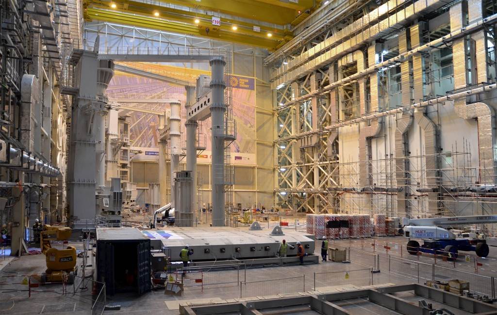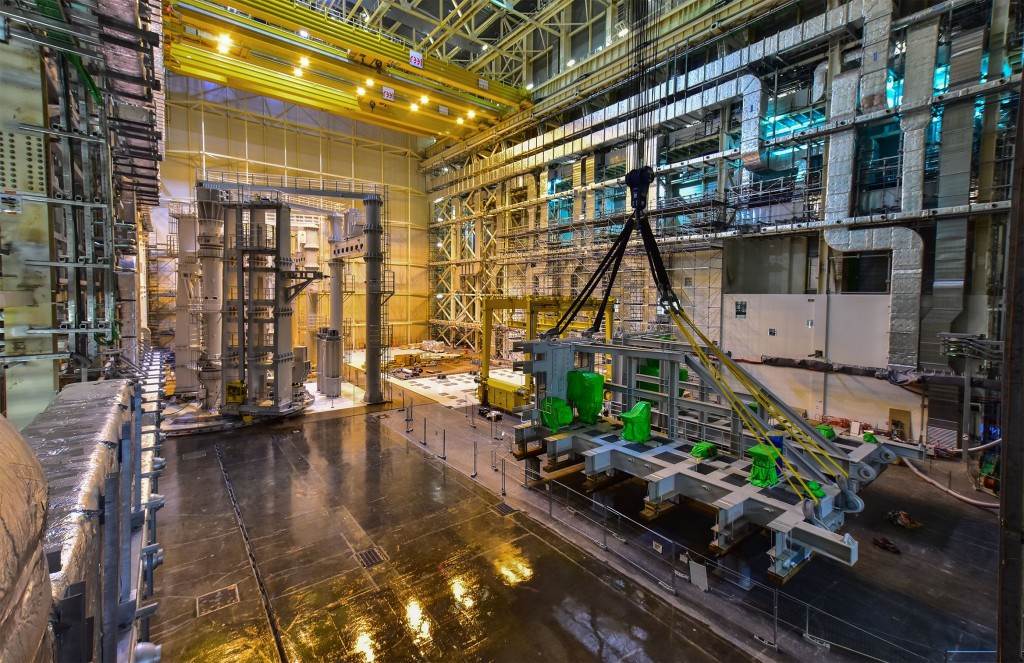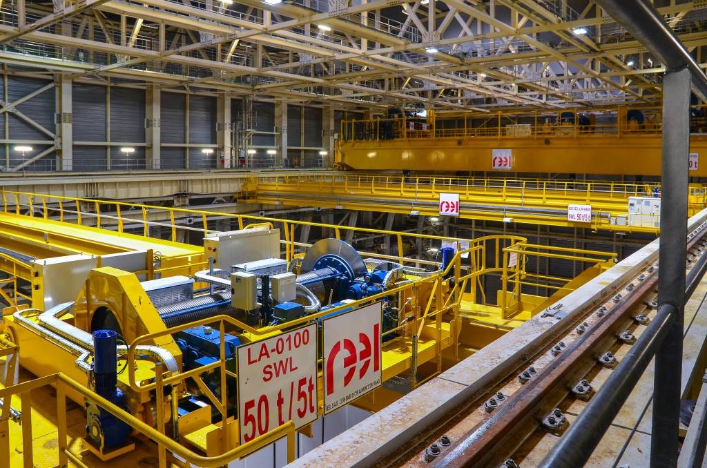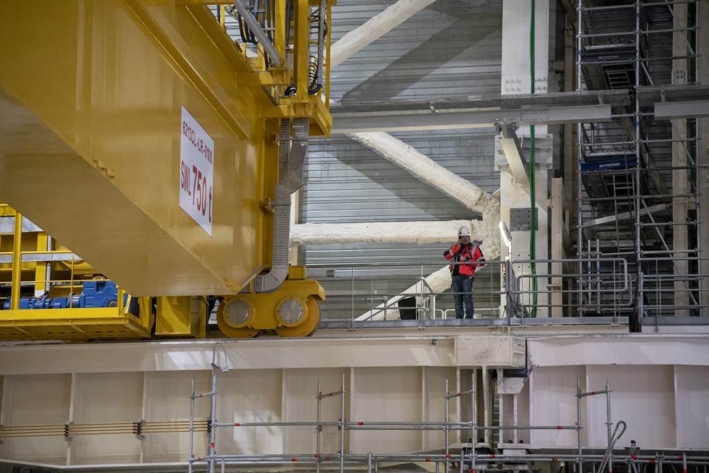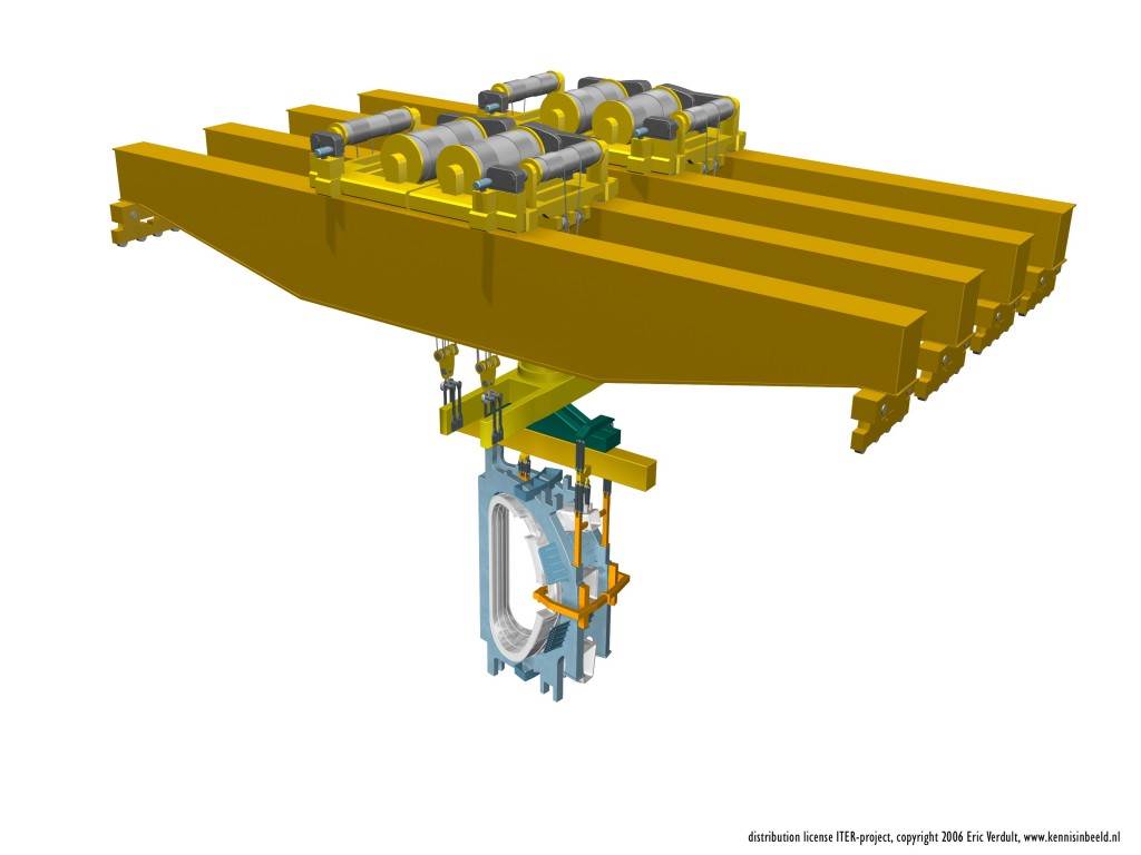 Two sets of bridge cranes installed at a height of 46 metres are the major lift and transport tools for delivering components from the Assembly Hall to the Tokamak pit. The heavy-duty set (two 750-tonne cranes) can work together to lift loads of 1,500 tonnes—or the approximate weight of four jetliners. The system is complemented by two smaller 50-tonne auxiliary cranes. (Procured by Europe)