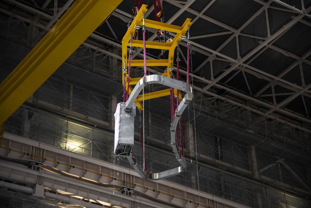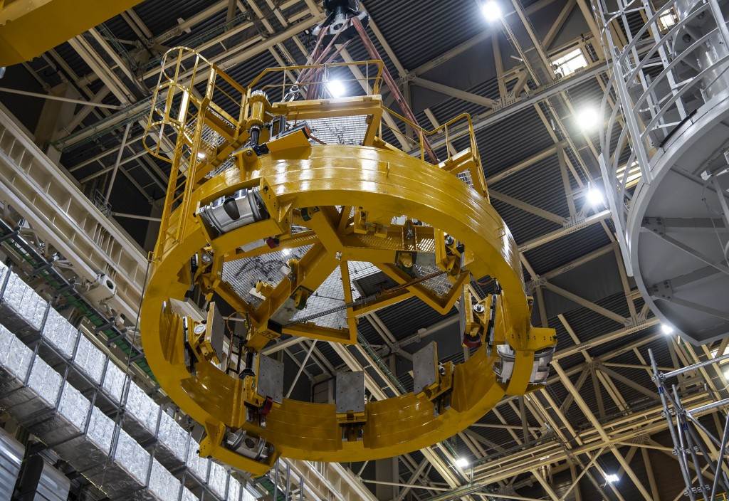Standing six storeys high in the Assembly Hall, the 800-tonne tools suspend the vacuum vessel sectors while carefully positioning and installing—via the rotary motion of the "wings"—thermal shield panels and two toroidal field coils. Actuators will permit the components to be positioned with the highest degree of accuracy (1.5 mm for the toroidal field coils) and adjusted to six degrees of freedom (up and down, side-to-side, forward and backward, swivel, tilt, and pivot). The completed "sector sub-assembly" to be transported to the Tokamak pit weighs 1,200 tonnes. The operation must be carried out nine times, for nine vacuum vessel sectors. (Procured by Korea)