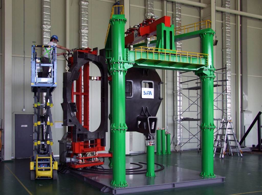 The in-pit installation tool for toroidal field coil pairs moves the D-shaped superconducting coils a few millimetres along three axes and ensures their precise positioning inside of the Tokamak pit to within 1/10th of a millimetre. It also performs the final adjustment of the Tokamak's nine sectors. (Procured by the ITER Organization)