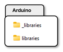 Since this folder already contains installed libraries, I recommend you temporarily rename it, e.g. to “_libraries” and create a new folder named “libraries”. This way you avoid conflicts with your already installed libraries and you don’t loose them either. Later you can easily revert this change. The picture below shows how your “Arduino” folder with the libraries should look like:
