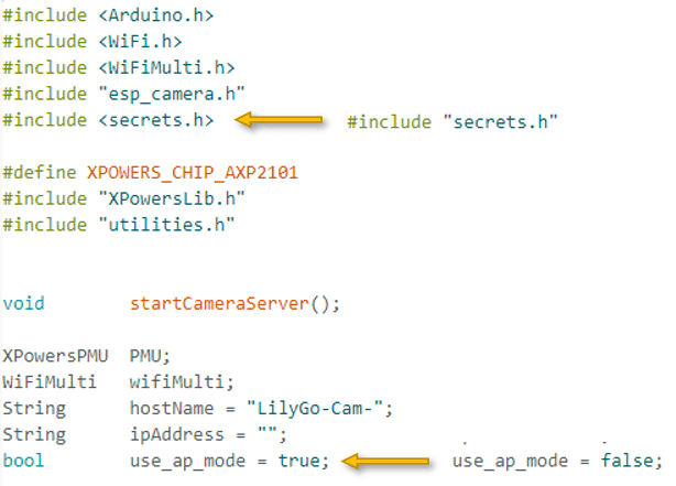 Finally, we need to make two changes in the MinimalCameraExample.ino file. Replace the angular brackets for the include of secrets.h by quotation marks and set the use_ap_mode flag to false:
