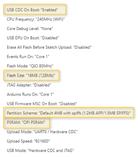 Most important are Flash Size, Partition Scheme and PSRAM. The other parameters should be the default settings but you better check. When printing to the Serial Monitor the USB_CDC_ON_BOOT configuration needs to be turned on.