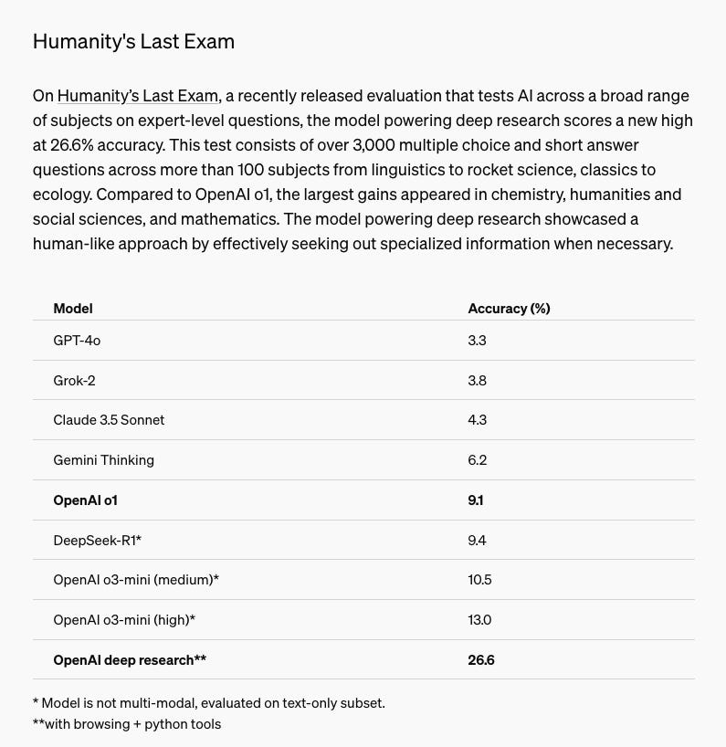 📝 Deep Research (wonder where they got the name inspiration from while taking a dig on DeepSeek) meanwhile is a search agent that conducts multi-step research on the internet as well as the user-uploaded files, with access to a Python tool for analysis. It is trained on hard browsing and reasoning tasks across a range of domains and already achieves more than 25% accuracy on the recently released Humanity’s Last Exam benchmark — a broad academic benchmark with broad subject coverage. Currently available only for Pro, it will be rolling out to the Plus and Team tier soon.