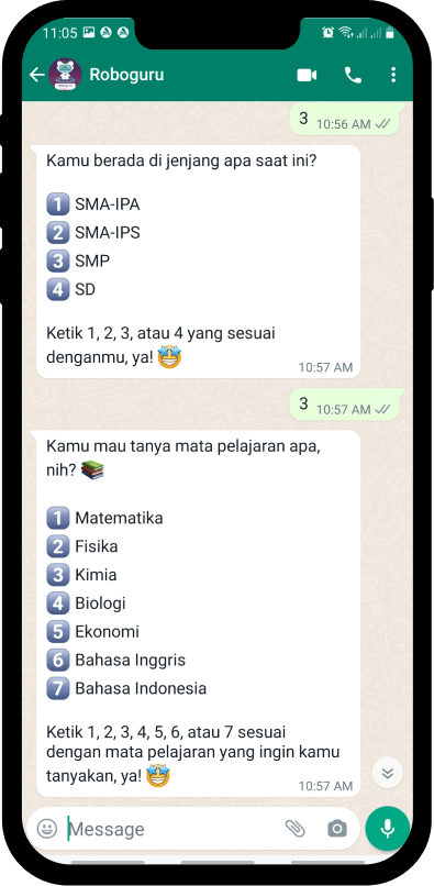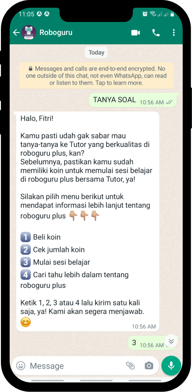 Pilih nomor 3 , lalu pilih jenjang dan mata pelajaran yang sesuai dengan pertanyaanmu, untuk memulai sesi