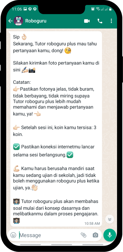 Kirim soal dan tulis pertanyaan, lalu kamu dapat terhubung dengan tutor melalui chat. Layanan ini tersedia untuk SD, SMP, dan SMA dengan mata pelajaran Matematika, Fisika, Kimia, Biologi, Ekonomi/Akuntansi, Bahasa Indonesia dan Bahasa Inggris.