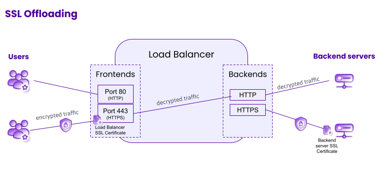 SSL offloading, also known as SSL termination, allows the user to initiate a secure connection with the Load Balancer thanks to the Load Balancer frontend's SSL certificate. The Load Balancer decrypts incoming HTTPS traffic. Layer 7 actions may therefore be applied to the traffic at this stage. Traffic is not re-encrypted on its way from the Load Balancer to the backend server, unlike with SSL bridging. Traffic that has gone through the offloading process is marked with a new header, called X-Forwarded-Proto, which informs the backend server that the client used HTTPS to contact the Load Balancer.
