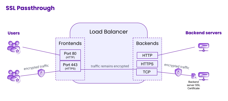 - SSL passthrough: The Load Balancer does not decrypt incoming HTTPS traffic, and sends it to the backend server 'as is'.