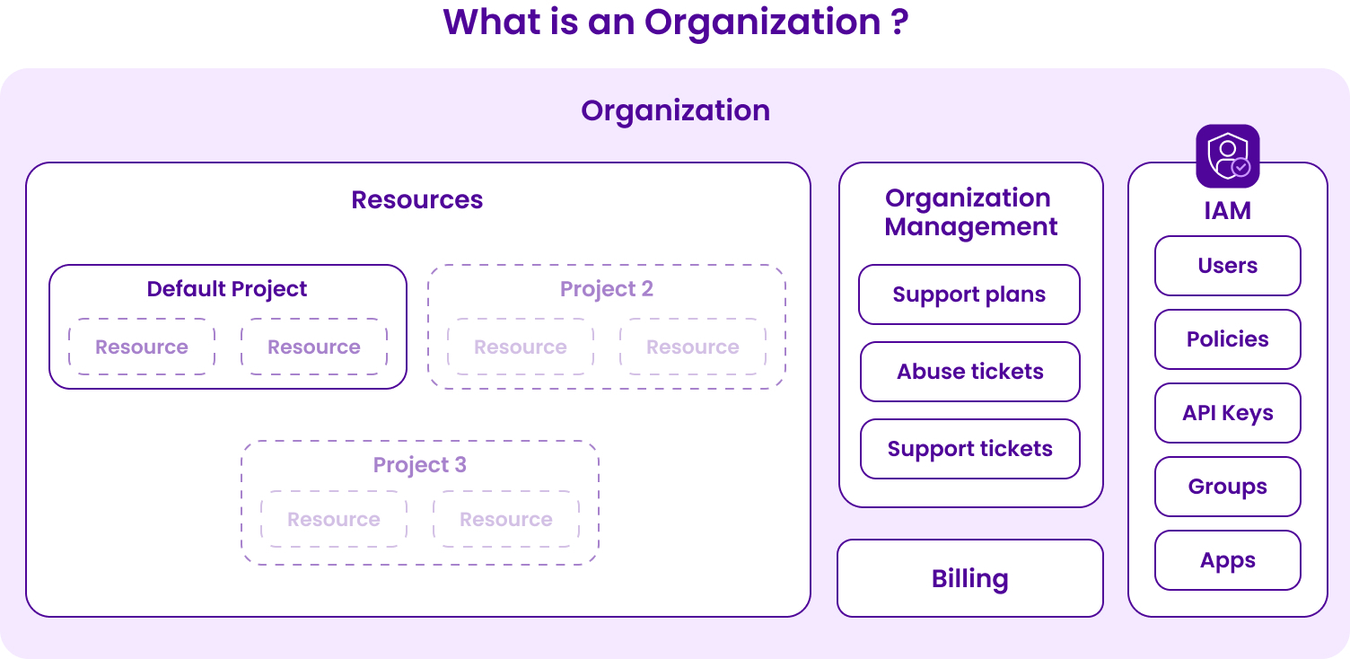 Each Organization has at least one associated Project. Upon account creation, this Project is called default. The Project name can be changed later. The default Project takes on the Organization ID. Therefore, the default status cannot be transferred to other Projects.