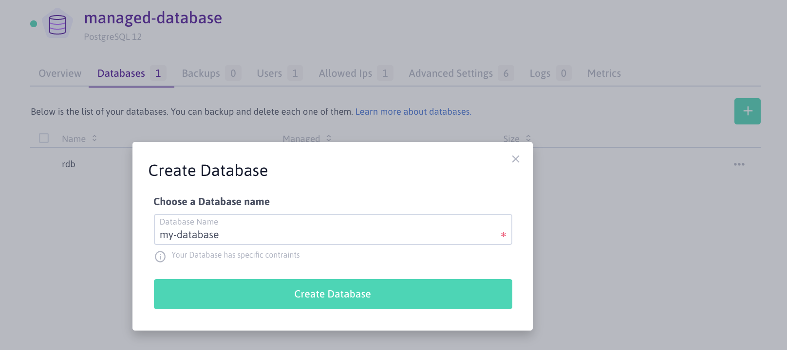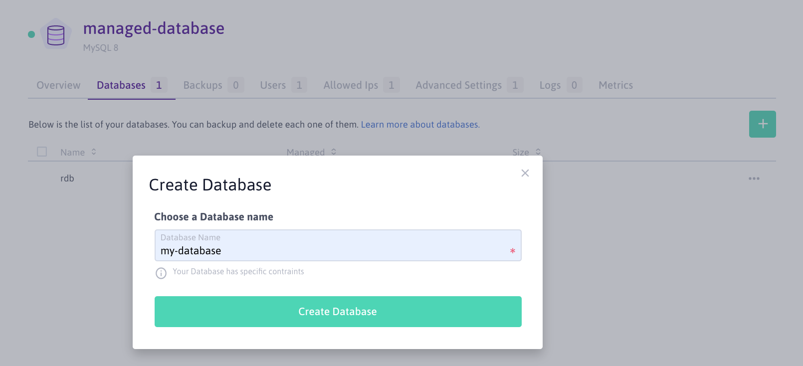- Click the Managed Databases tab, then on + Create Database to create a new database in the instance.