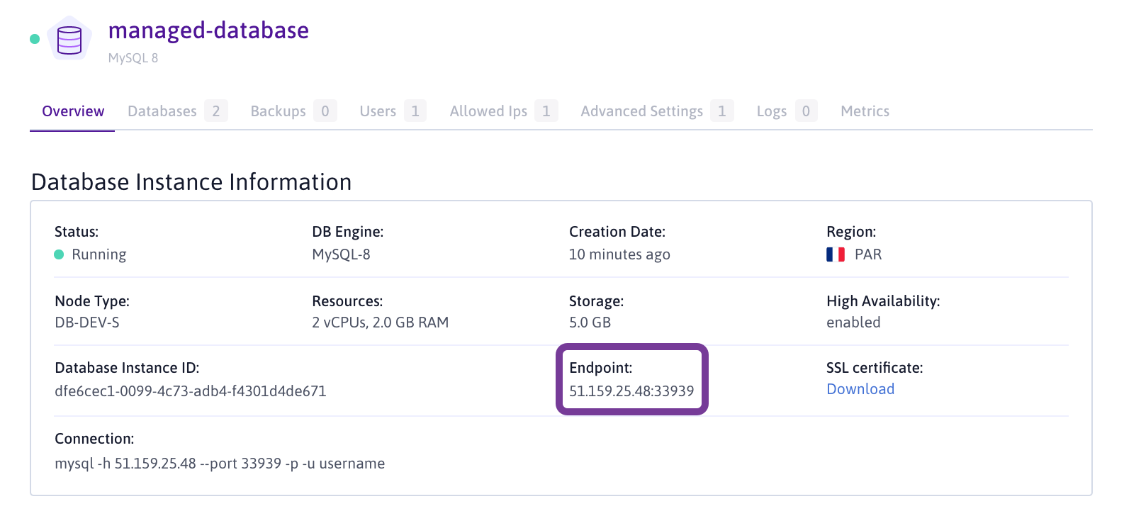 Retrieve the database host and port from your Scaleway console. The Endpoint information is visible on your Database information page: