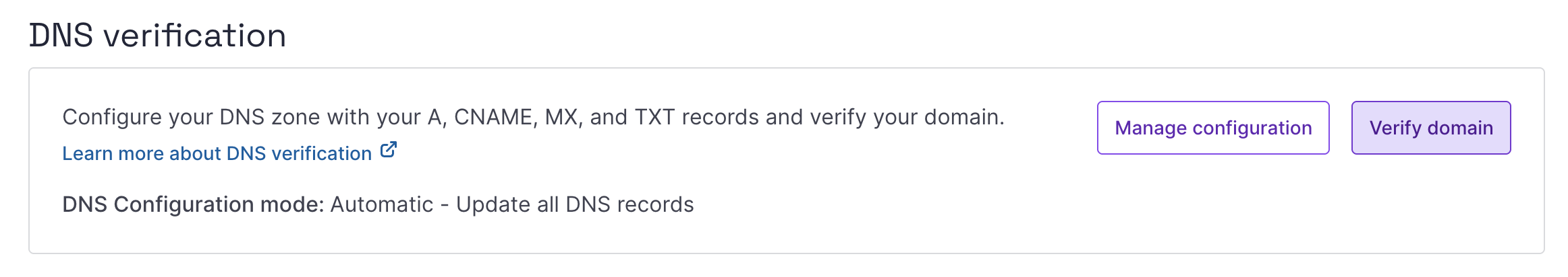 - After updating your DNS configuration, click Verify domain. This initiates the DNS verification process. Once the process is complete, a green check with the text Configured will display next to the nameservers and records to configure.