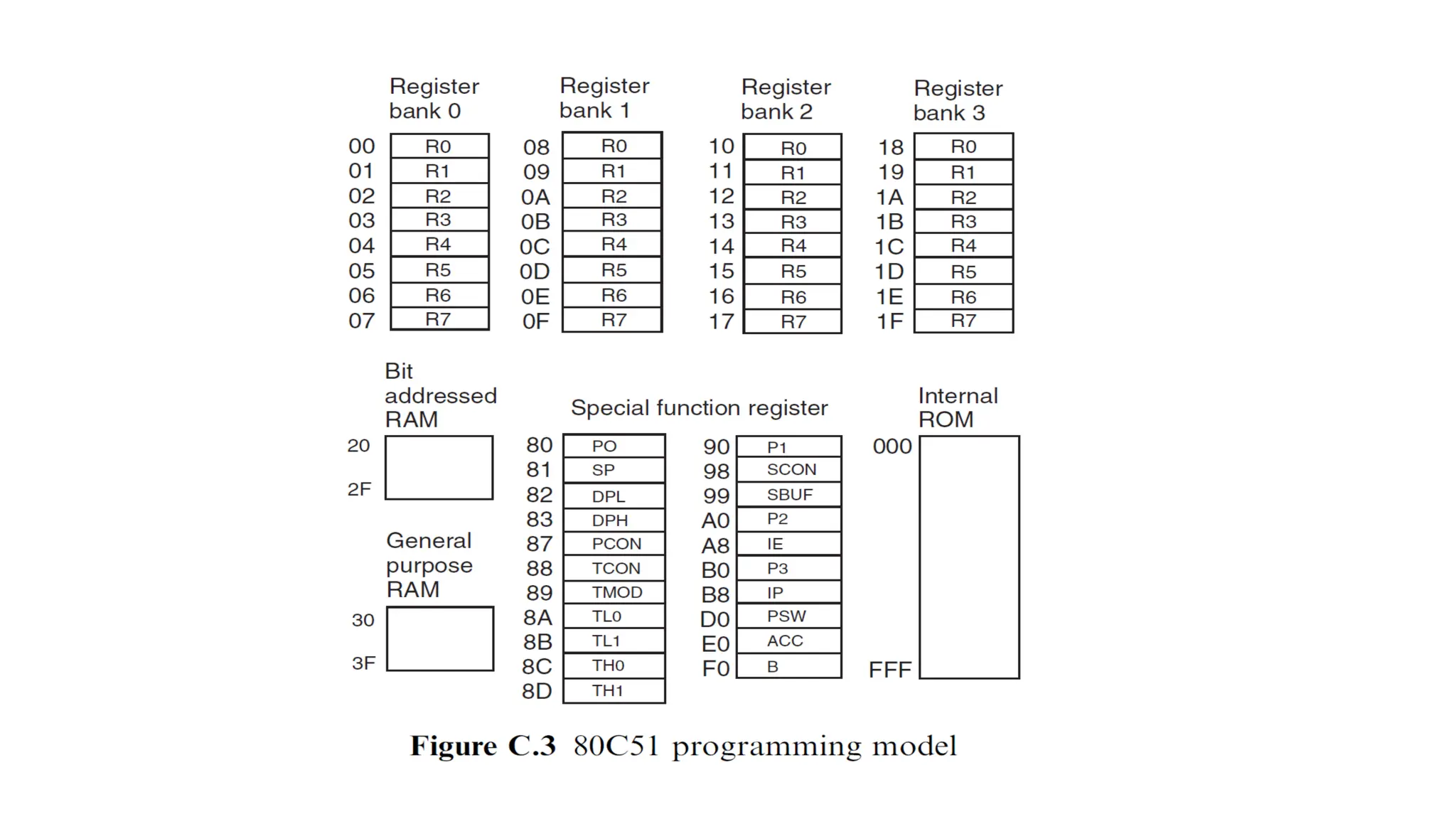 8051 Memory StructureData random access memory is divided into 4 parts: First 128 bytes : 00H TO 1FH (31) – Register Banks 20H TO 2FH(47) – Bit addressable RAM 30H TO 7FH (127) – General purpose registers Next 128 bytes : 80H TO FFH (255) – Special function registers