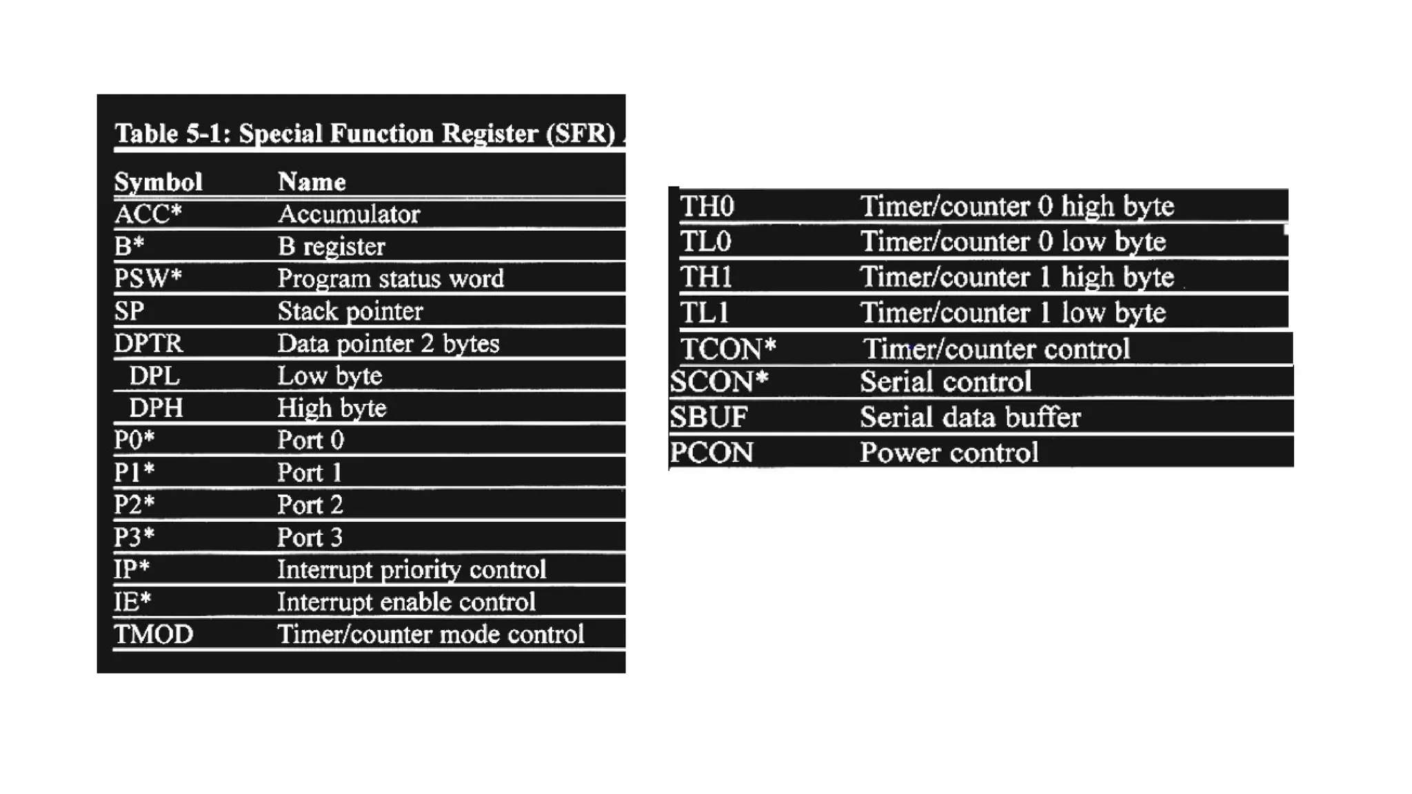 LIST OF REGISTERS •Accumulators - A and B • Process Status Word - PSW • I/O port registers - P0, P1, P2, P3 • Data pointers - DPH and DPL • Serial data buffer register - SBUF • Stack pointer - SP • Timer registers - TH0, TH1 and TL0, TL1 • Timer Control Registers - TCON, TMOD • Power and Port control - PCON, SCON • Interrupt Control Registers - IP, IE.