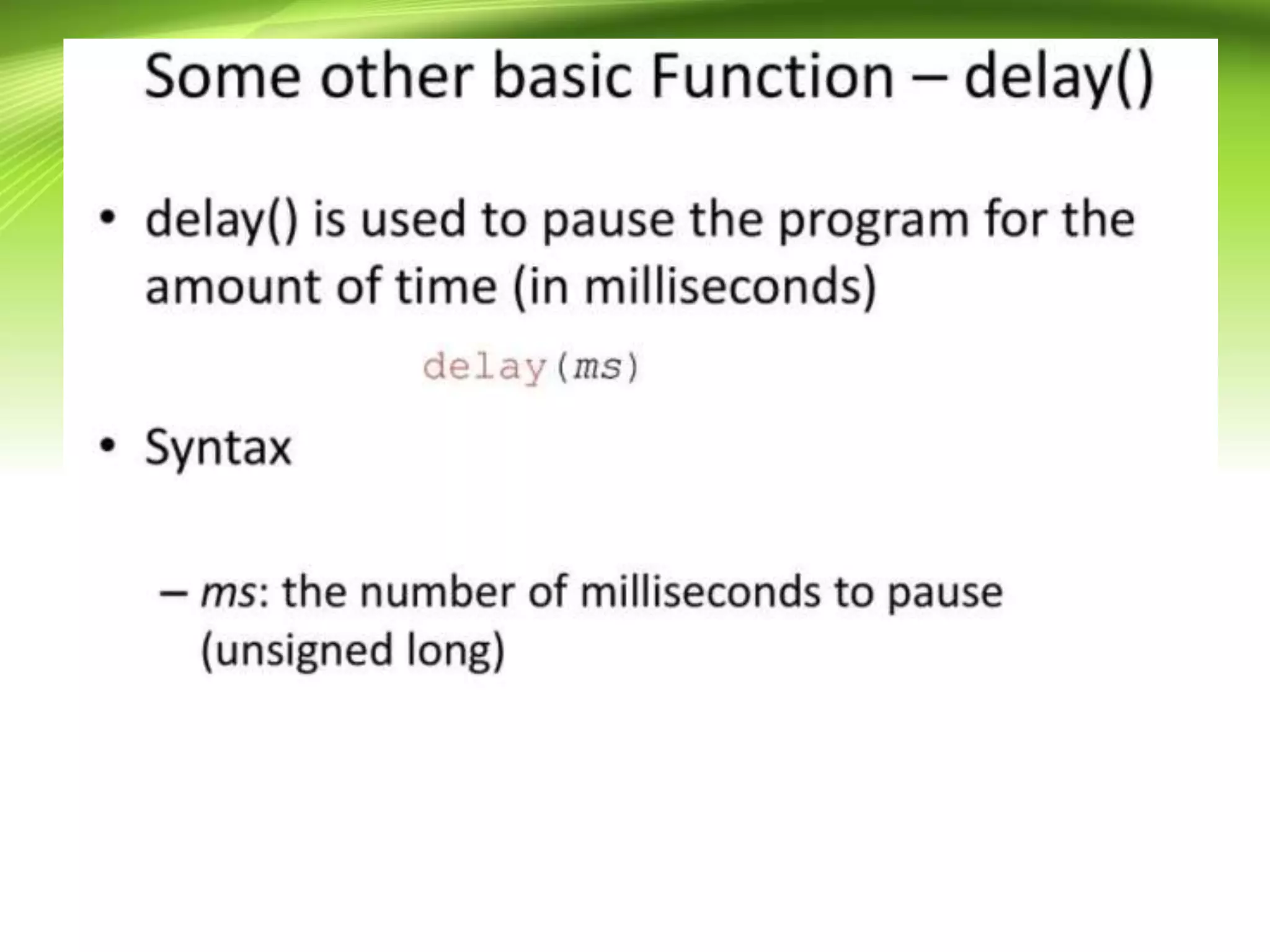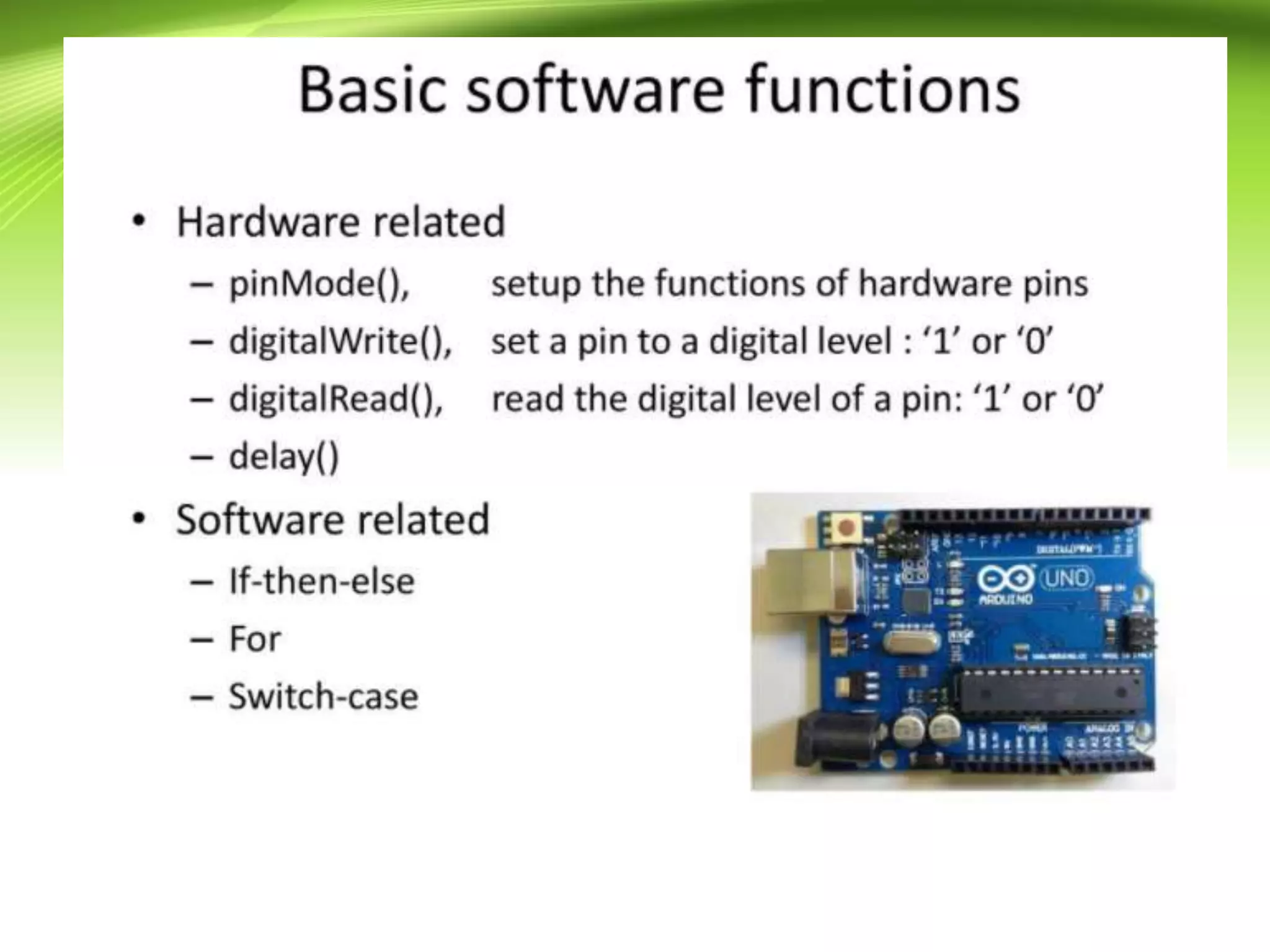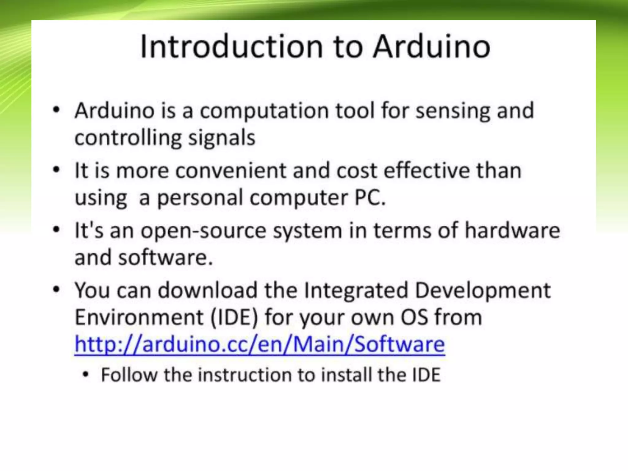 The document provides an overview of the Arduino programming language, which is based on the Wiring development platform. It explains the essential structure of Arduino programs, divided into three main parts: structure, values (variables and constants), and functions, focusing on the setup() and loop() functions. The tutorial aims to guide readers in writing Arduino programs without syntax or compilation errors.