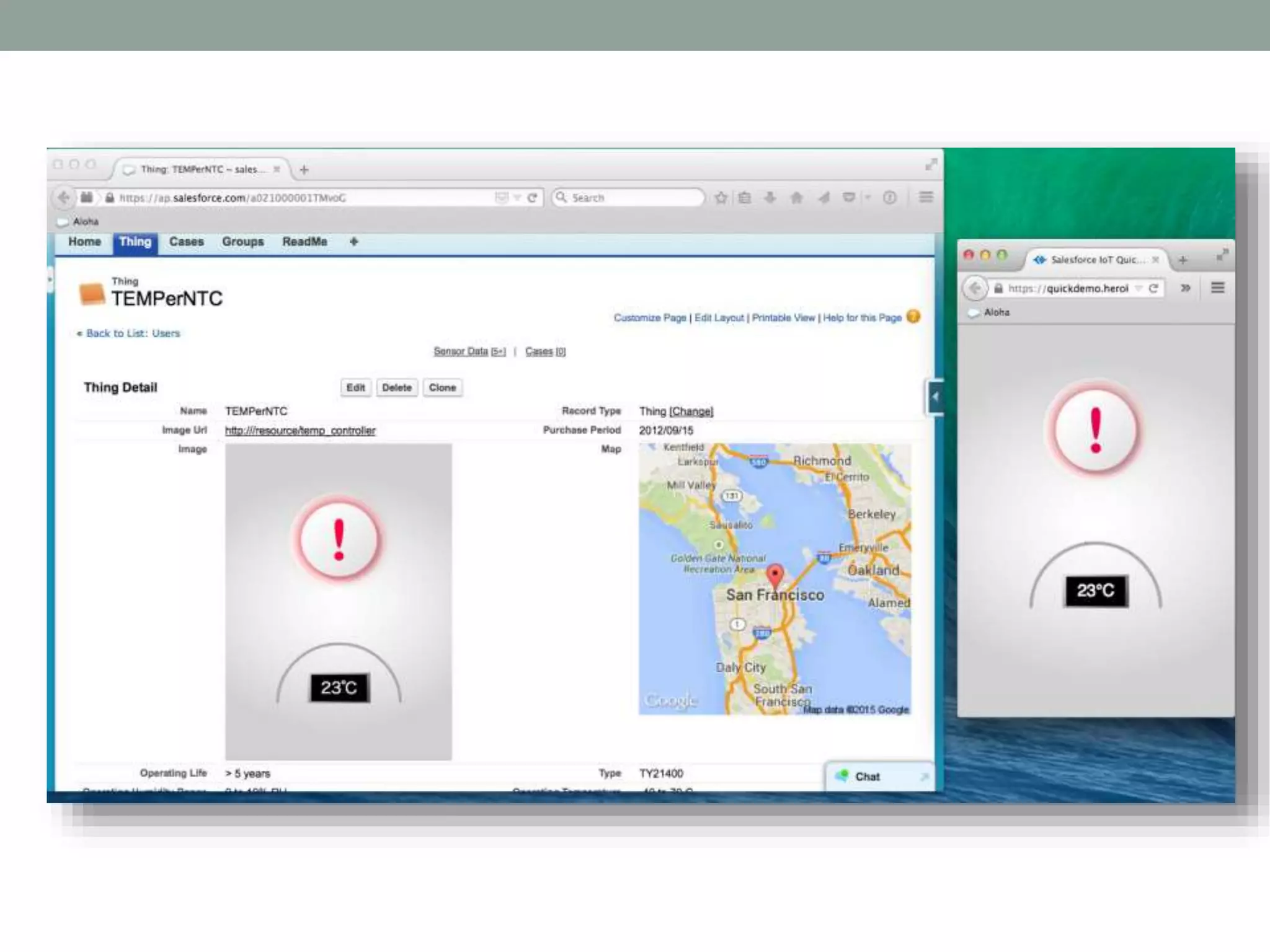 The document outlines a demonstration of an IoT application integrated with Salesforce using Heroku, detailing installation steps and various demo scenarios including temperature monitoring and geo-location tracking. It covers necessary configurations, such as entering user details, setting up alerts based on thresholds, and optional features like Twilio integration for notifications. The document highlights the use of web-based device UI applications on both iOS and Android, emphasizing the real-time data exchanges and the resultant actions within Salesforce.