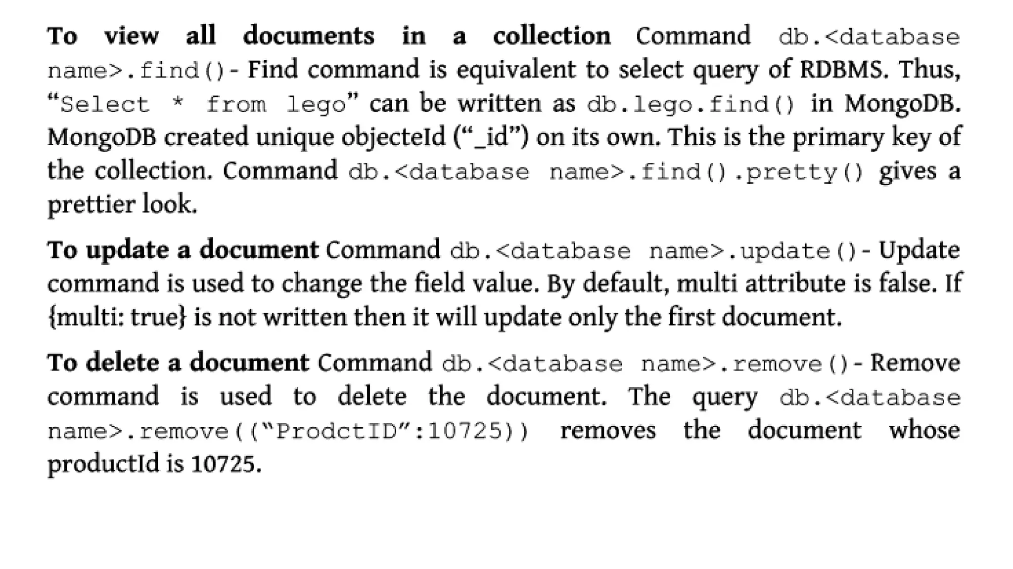 To Create database: Commandis use — use command creates a database; For example, Command use lego creates a database named lego. (A sample database is created to demonstrate subsequent queries. The Lego is an international toy brand). Default database in MongoDB is test. To see the existence of database: Command is db — db command shows that lego database is created. To get list of all the databases: Command is show dbs — This command shows the names of all the databases.