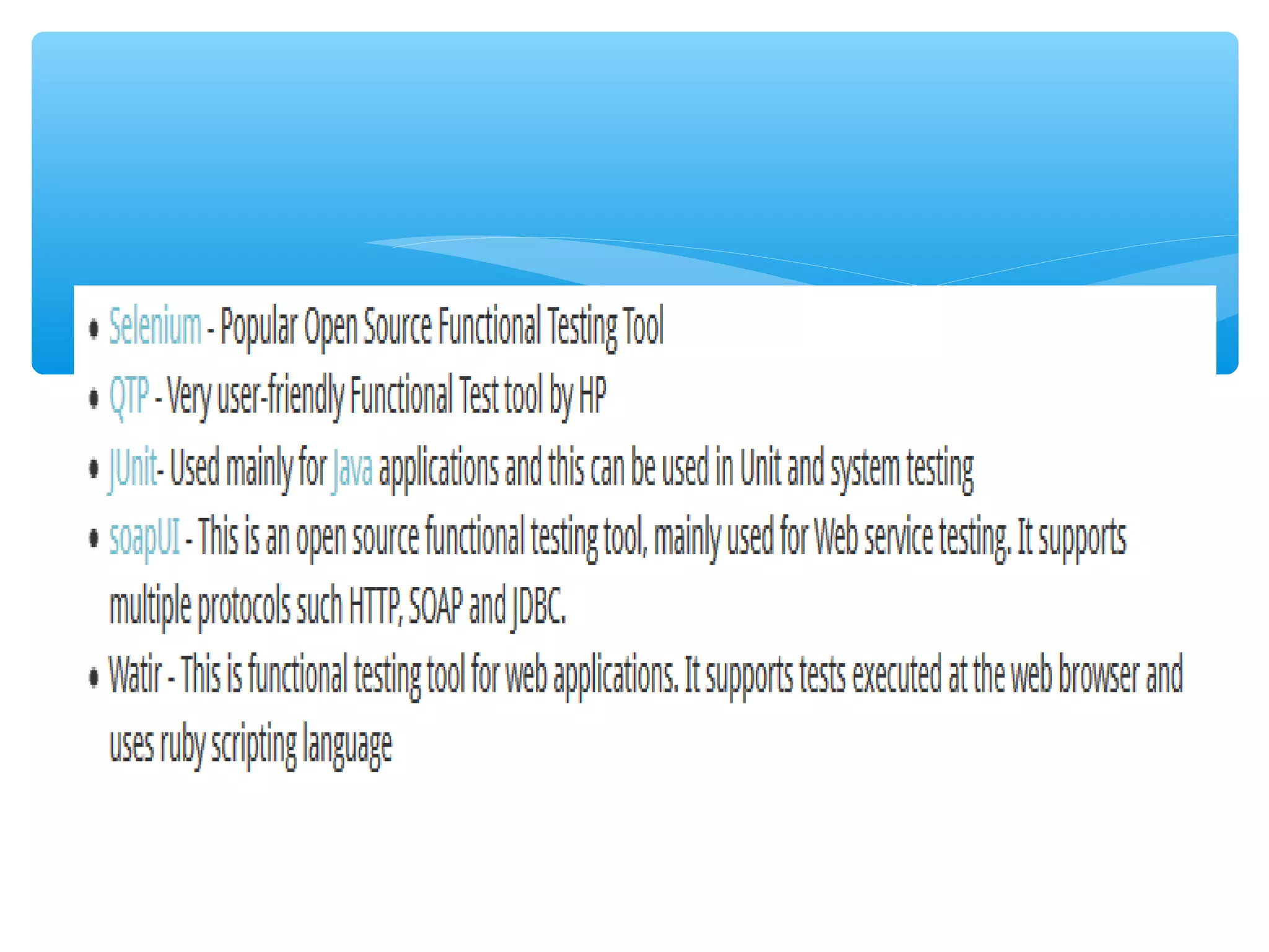 Functional testing types include: - Testing functionality according to requirements - Testing web services interfaces and compliance with standards - Conducting testing for software version changes and data migration Non-functional testing types include: - Performance testing to ensure systems meet specified performance levels - Load testing to identify bottlenecks and determine behavior under heavy loads - Stress testing to detect errors under excessive operational capacity - Compatibility testing to ensure applications work in different environments - Security testing to adopt security procedures and probe for vulnerabilities - Usability testing to evaluate from an end-user perspective
