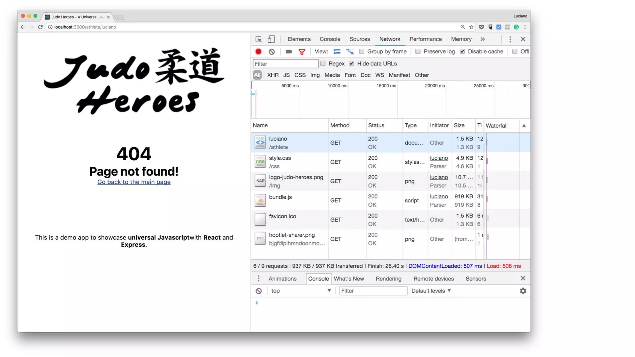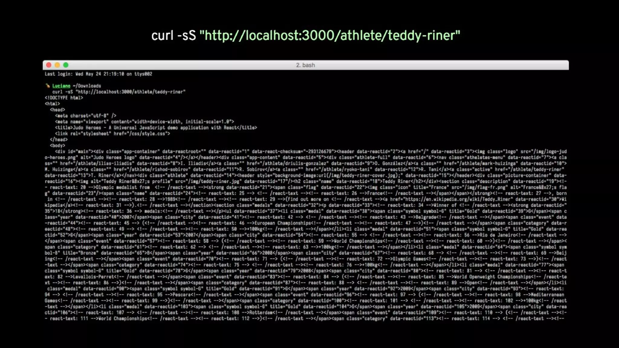 The document outlines a workshop on Universal JavaScript with React, presented by Luciano Mammino, covering topics such as setting up a local development environment, component structure, and routing with React. It emphasizes the benefits of Universal JavaScript, like SEO advantages and improved load times, while providing hands-on exercises and demonstrations for creating components and managing state. Additionally, it includes practical guidance for building a 'Judo Heroes' application, complete with sample code and development tools.