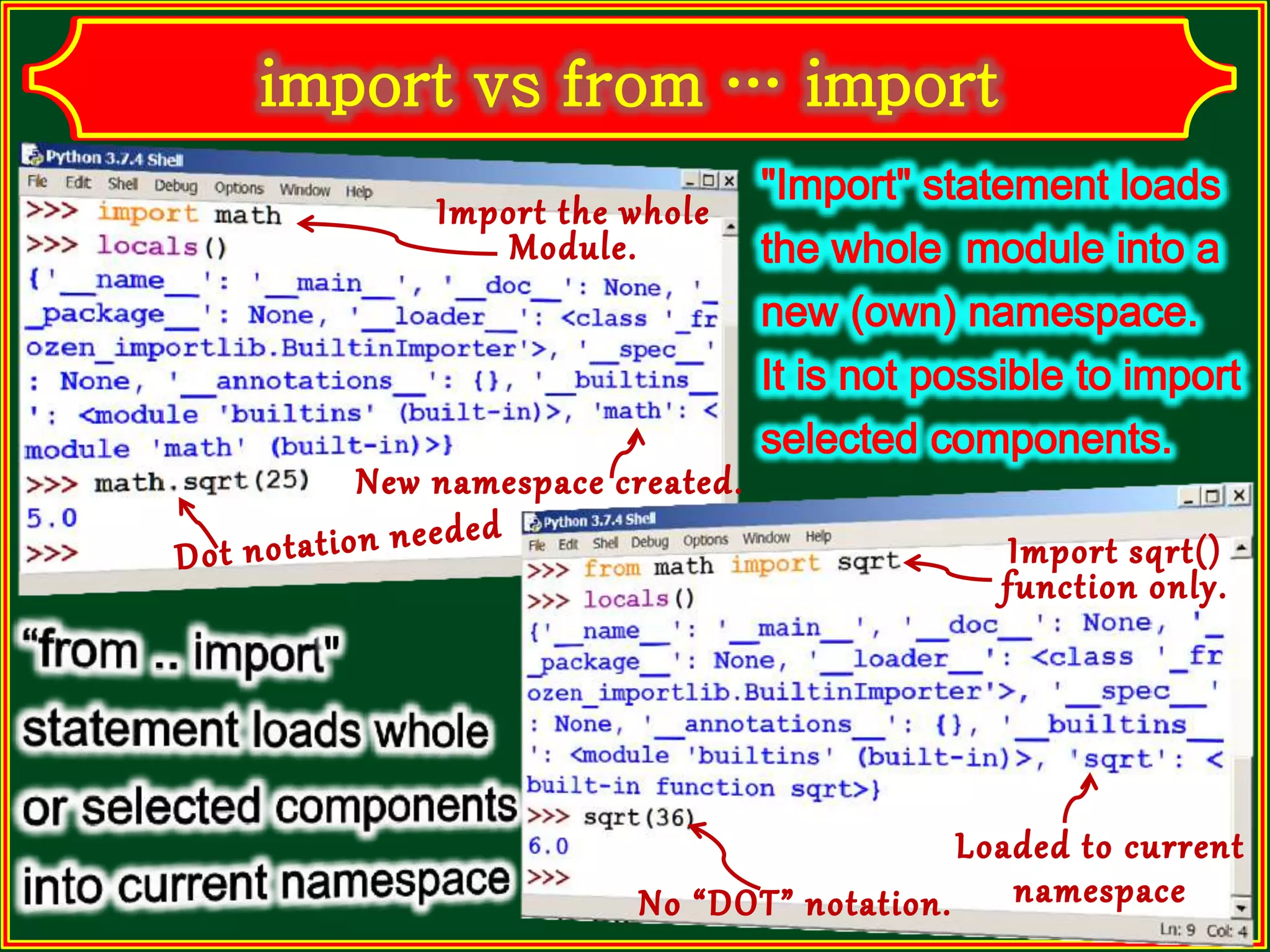 The "Import" statementloads a module into its own namespace, so you must enter the module name and dot before their components. The "from… import" statement loads the module components into the current namespace so you can use it without mentioning the module name.
