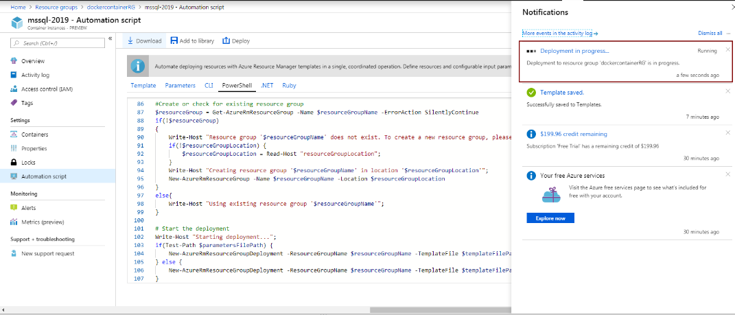 Azure Container Instance (ACI) is a service offering for managing and running containers on the Azure cloud. In this article you’ll see in detail, how to setup and automate SQL Server 2019 installation on Azure Container Instance using the Azure PowerShell module. Also, I will show you how to create a template for the same. The template is a JSON file, which gives you the ability to modify the input parameters as you would edit plain text, and helps perform a successful deployment in a relatively simpler way.