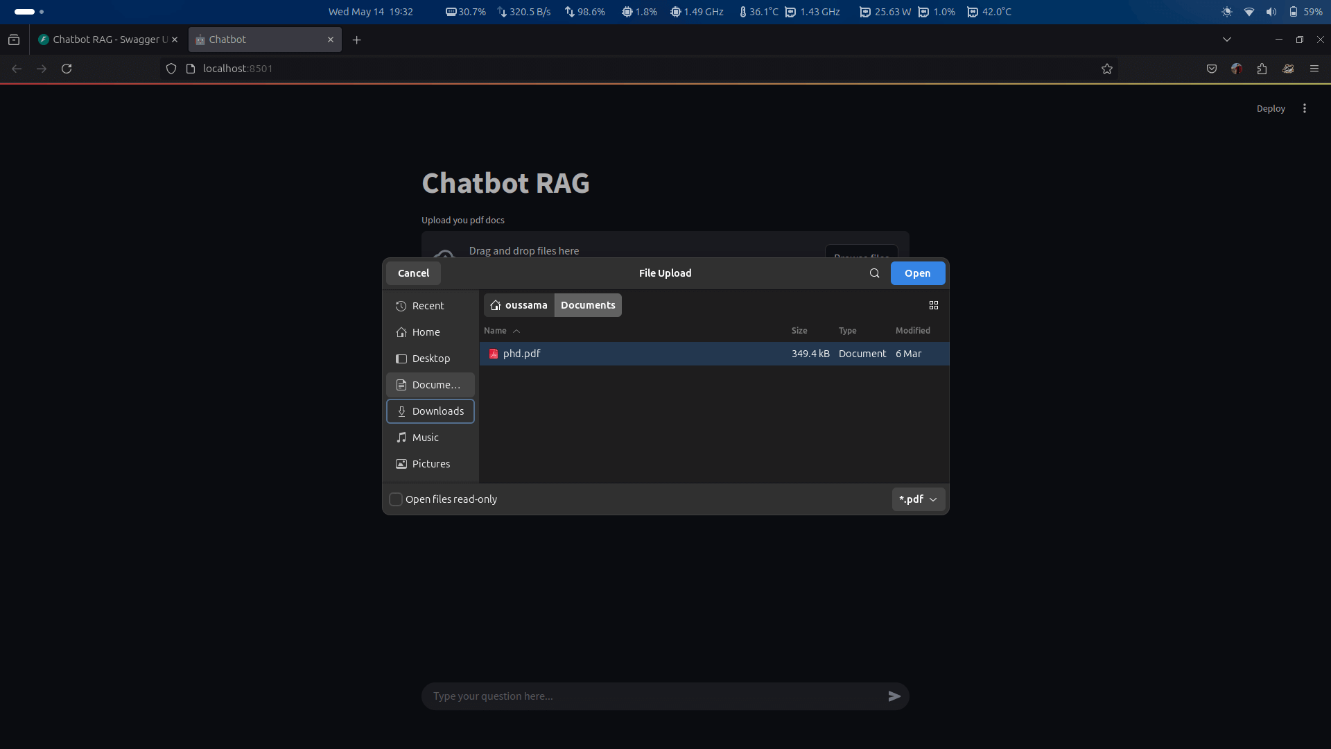 Start by uploading one or more PDF files that the chatbot will use to answer your questions. On the Streamlit web interface, click the Upload your PDF docs button and select your files.