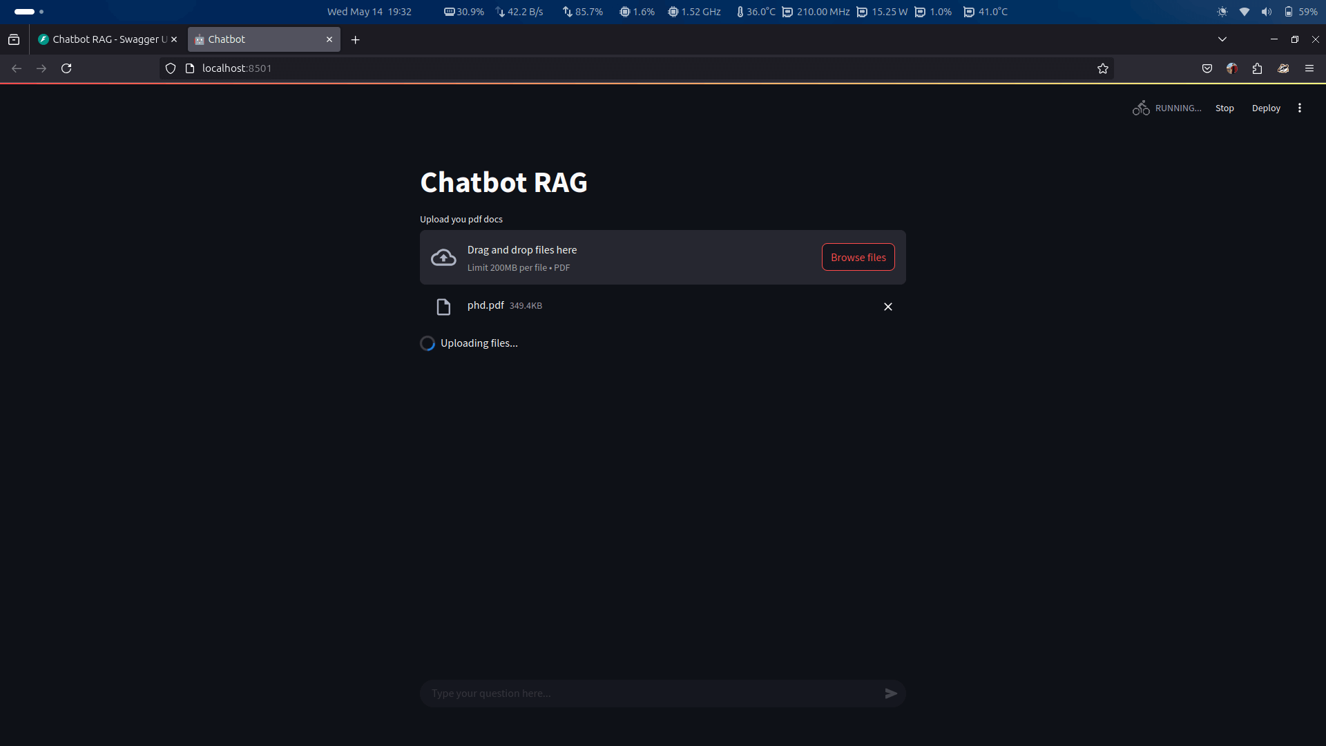 def ask(query: str) -> str: with st.spinner("Asking the chatbot..."): response = requests.get(f"{API_URL}/ask?query={query}") if response.status_code == 200: data = response.json() return data["answer"] else: return "I couldn't find an answer to your question." API_URL = "http://localhost:8000" # Change if deploying elsewhere st.set_page_config(page_title="Chatbot", page_icon="🤖") st.title("Chatbot RAG") Allow users to upload multiple PDF files, which are sent to the backend for parsing and storage.